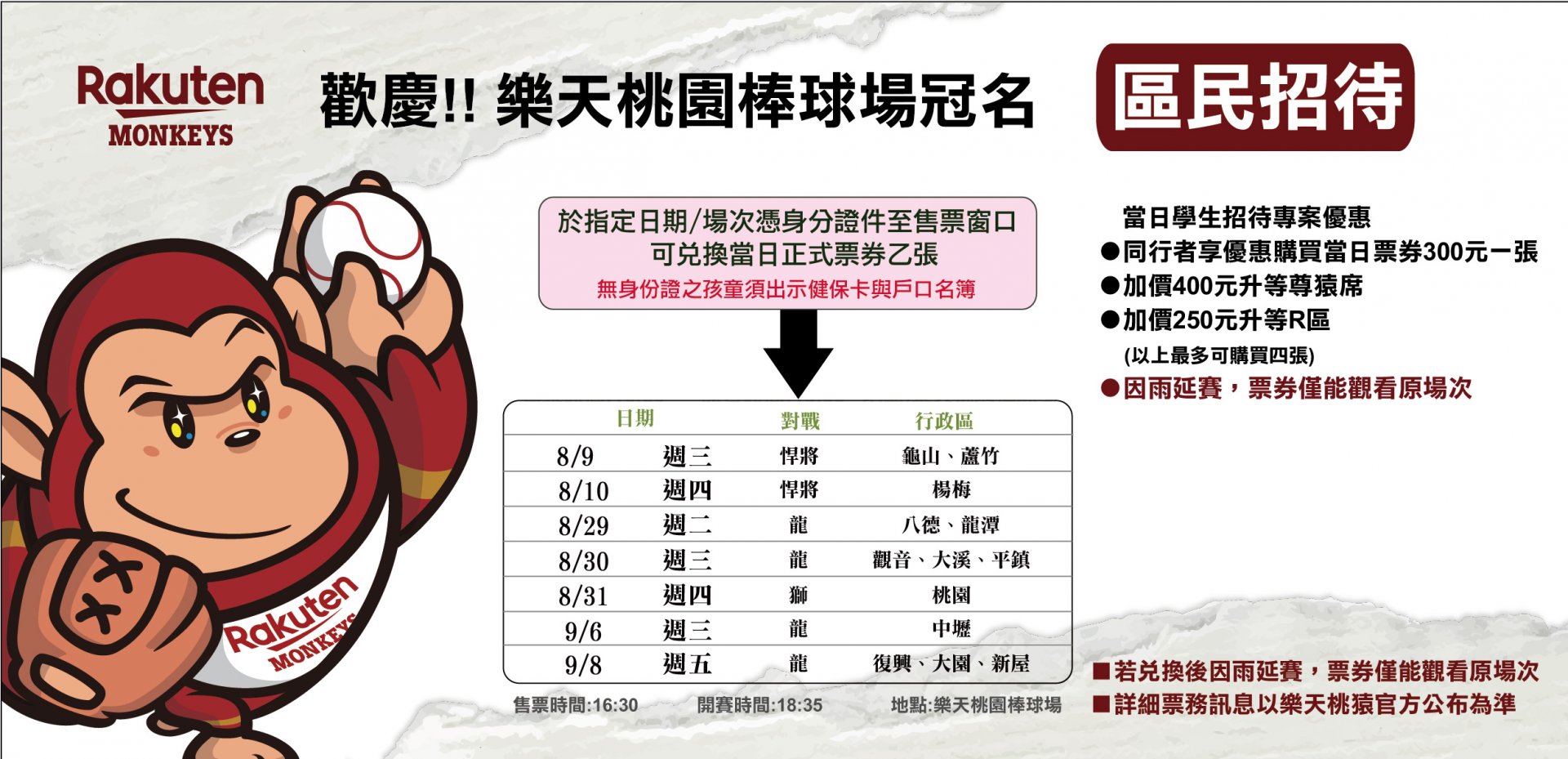 | 三、 | 樂天於112年8月起安排7場次免費招待桃園市民及桃園市高中、國中、國小學生免費進場觀賽,各行政區民眾可於各區優惠當日持身分證件(無身分證之孩童須出示健保卡及戶口名簿)至現場索取免費門票,學生則可持桃園市學生證至7場次現場索取免費門票,場次分別為8月9日(龜山、蘆竹)、8月10日(楊梅)、8月29日(八德、龍潭)、8月30日(觀音、大溪、平鎮)、8月31日(桃園)、9月6日(中壢)、9月8日(復興、大園、新屋)。 |