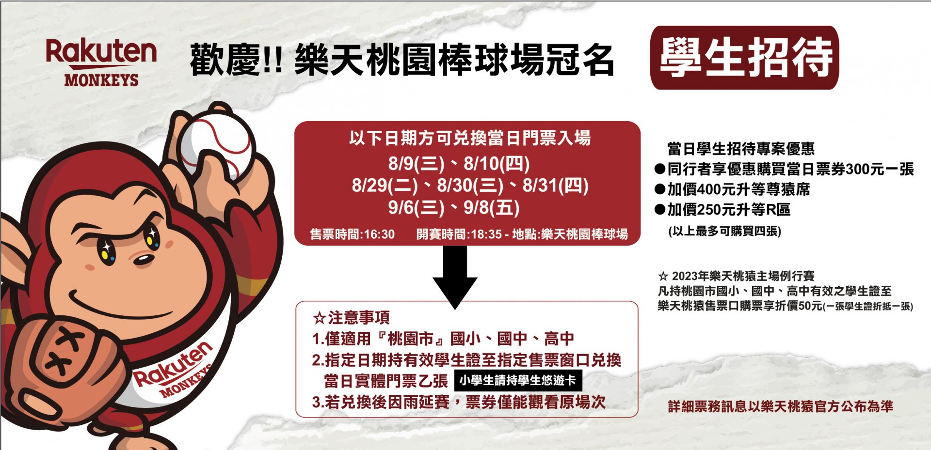 | 四、 | 此外,本季加碼回饋本市高、國中小學生持學生證至現場購票,每場次享票價折扣50元,歡迎市民朋友踴躍進場看球,共挺桃猿;為利民眾充分知悉活動資訊,請各校協助公告周知,鼓勵學生進場觀賽。 |