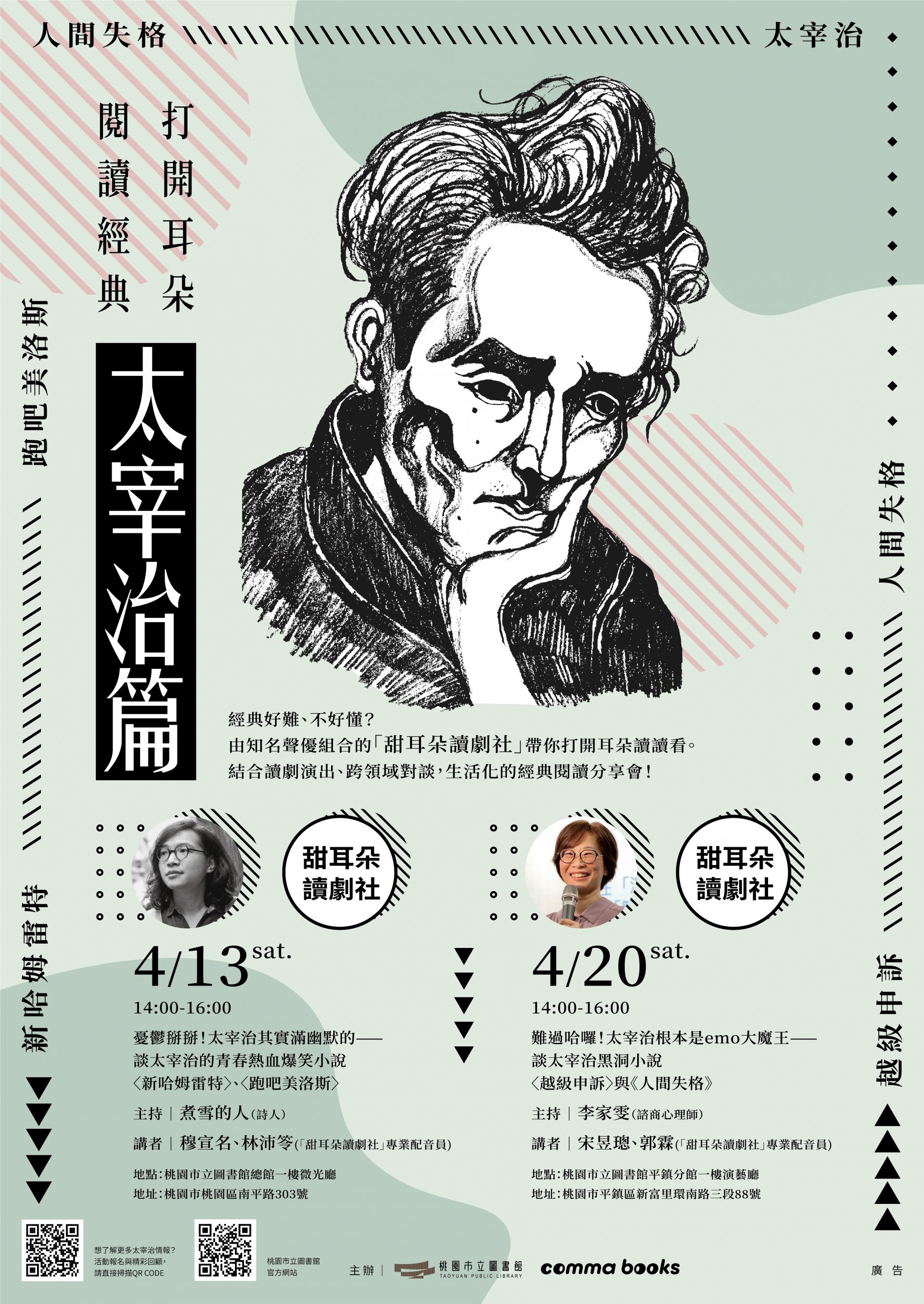 (一)「打開耳朵閱讀經典:太宰治篇!」:以讀劇方式演出,用聽覺感受太宰治筆下人物的極端情感,介紹一代文豪繽紛好笑卻又哀愁無比的多元創作面向。(活動詳情:https://www.typl.gov.tw/zh-tw/Activity/Content/6282)