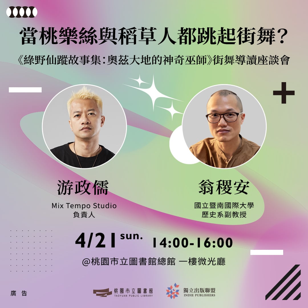 (二)「當桃樂絲與稻草人都跳起街舞?——《綠野仙蹤故事集:奧茲大地的神奇巫師》街舞導讀座談會」:帶動現場大家用身體來閱讀《綠野仙蹤》,帶讀者重新思考閱讀的可能。(活動詳情:https://www.typl.gov.tw/zhtw/Activity/Content/6295)