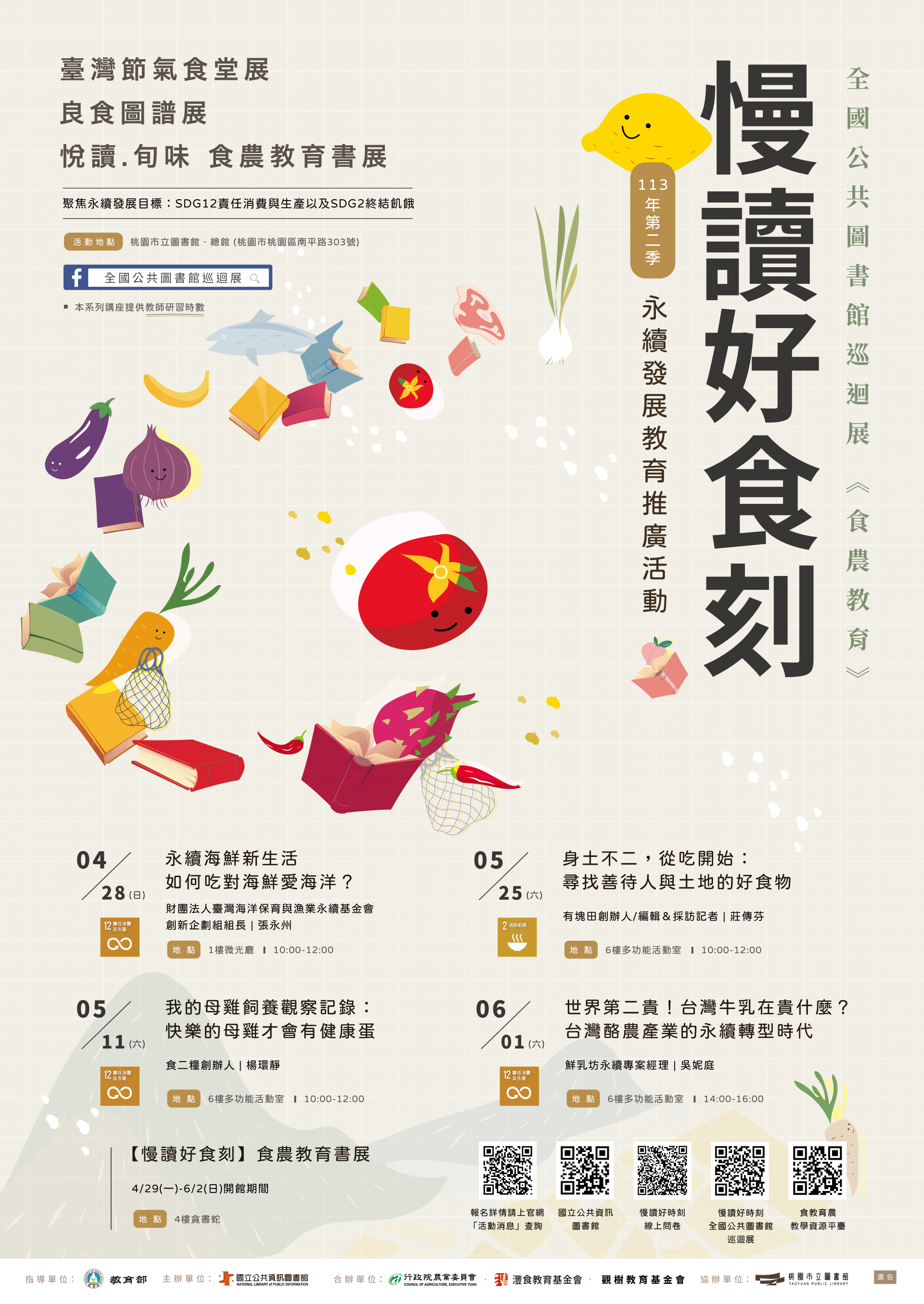 (三)「113年第二季永續發展教育推廣活動」:本次將聚焦永續發展目標:SDG12責任消費與生產以及SDG2終結飢餓,並配合國立公共資訊圖書館主辦之慢讀好食刻主題展,搭配書展推廣食農教育。(活動詳情:https://www.typl.gov.tw/zh-tw/Activity/Content/6304)