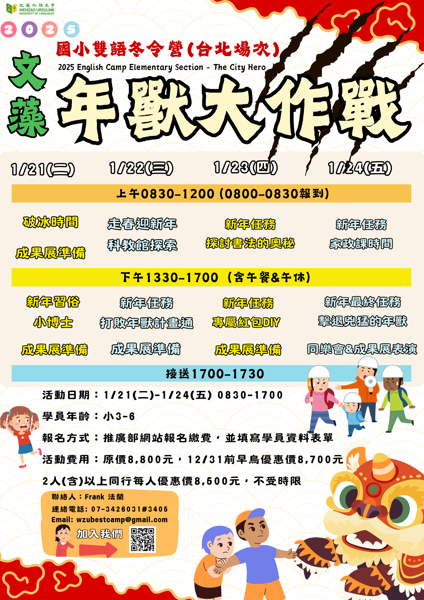 (一) | 「年獸大作戰」:民國114年1月21日(星期二)至114年1月24日(星期五),上午8時至下午5時。 |