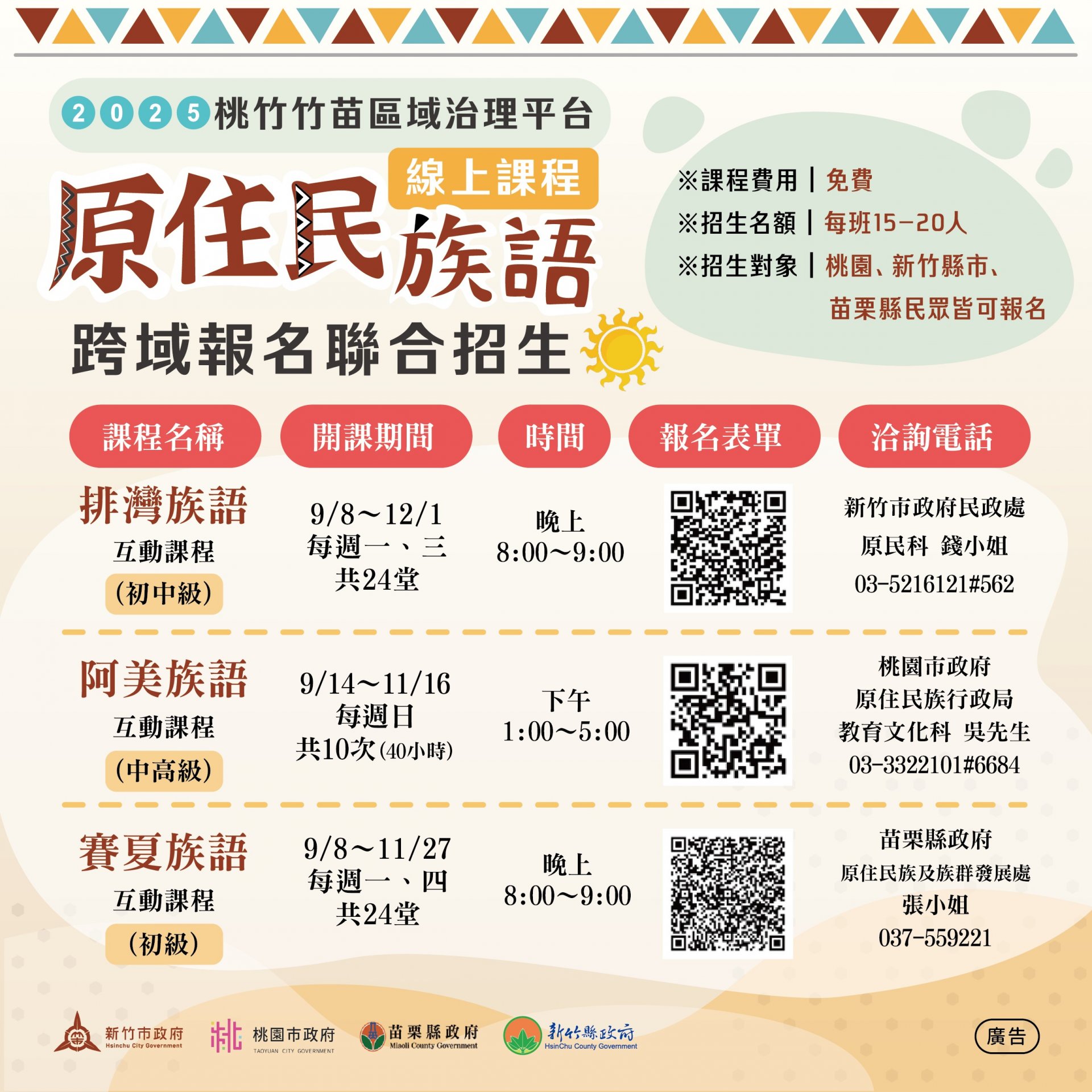 二、 為促進原住民族語學習資源共享與文化傳承,桃園市、新竹縣、新竹市及苗栗縣等四縣市政府攜手合作,整合原住民族語線上課程資源,推出「原住民族語線上課程聯合招生」計畫,開放四地民眾自由報名選修,突破區域與交通限制,實現族語學習「零距離」,有效提升學習便利性與參與率,促進資源共享並推動文化傳承。