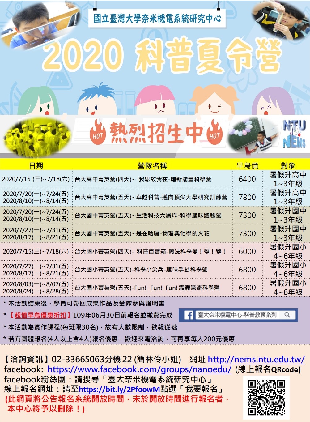 一、為有效推廣科學科技回應社會議題,並厚植我國科學文化向下紮根,本校「2020年科普夏令營」將推出「高中」、「國中」及「國小」之菁英課程。
