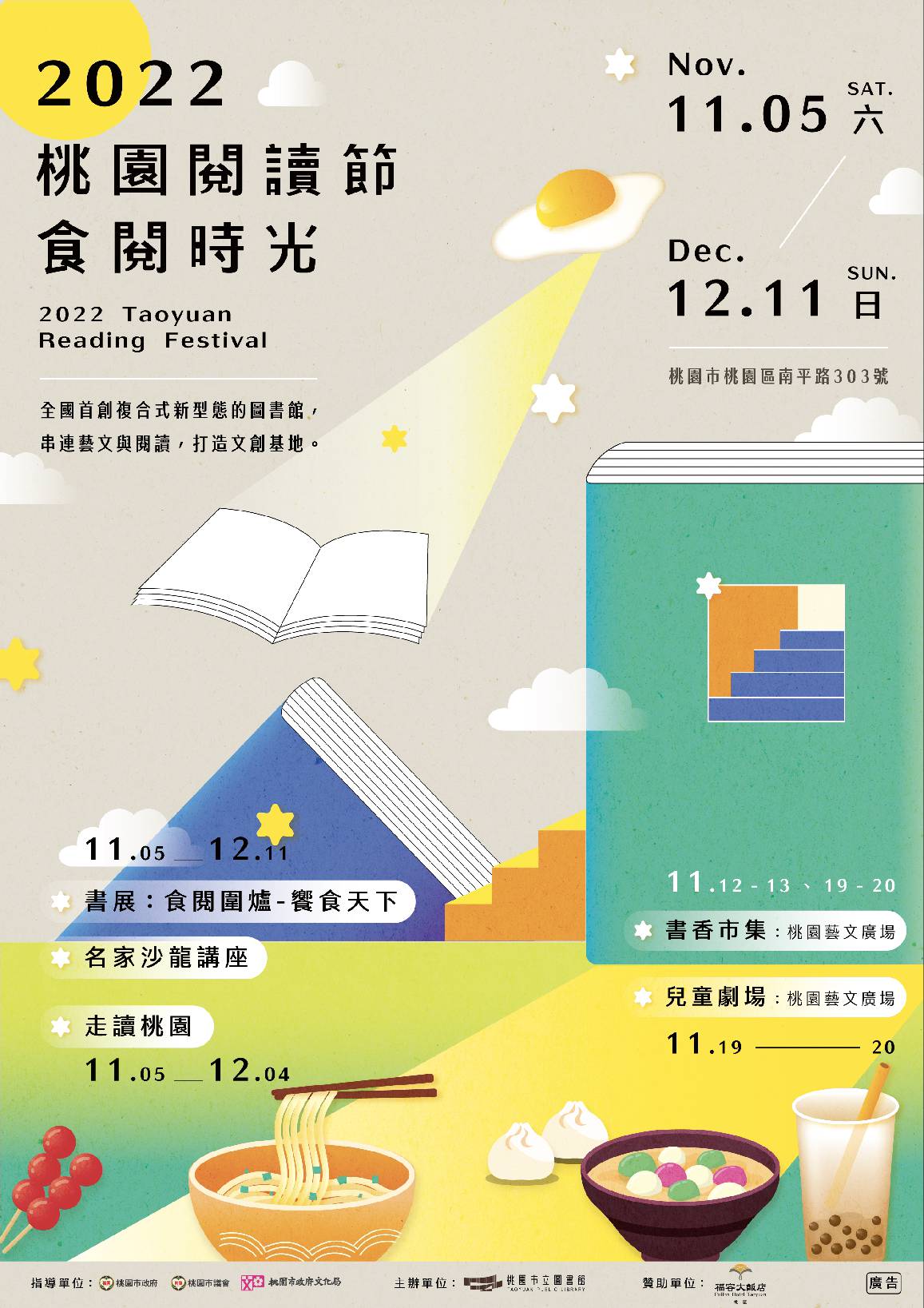 一、桃園市立圖書館規劃「2022桃園閱讀節『食閱時光』」,期盼藉由全市性的節慶閱讀嘉年華,提升桃園市整體閱讀習慣及風氣,在新總館、各分館、獨立書店或本市藝文場所辦理各項豐富閱讀活動。