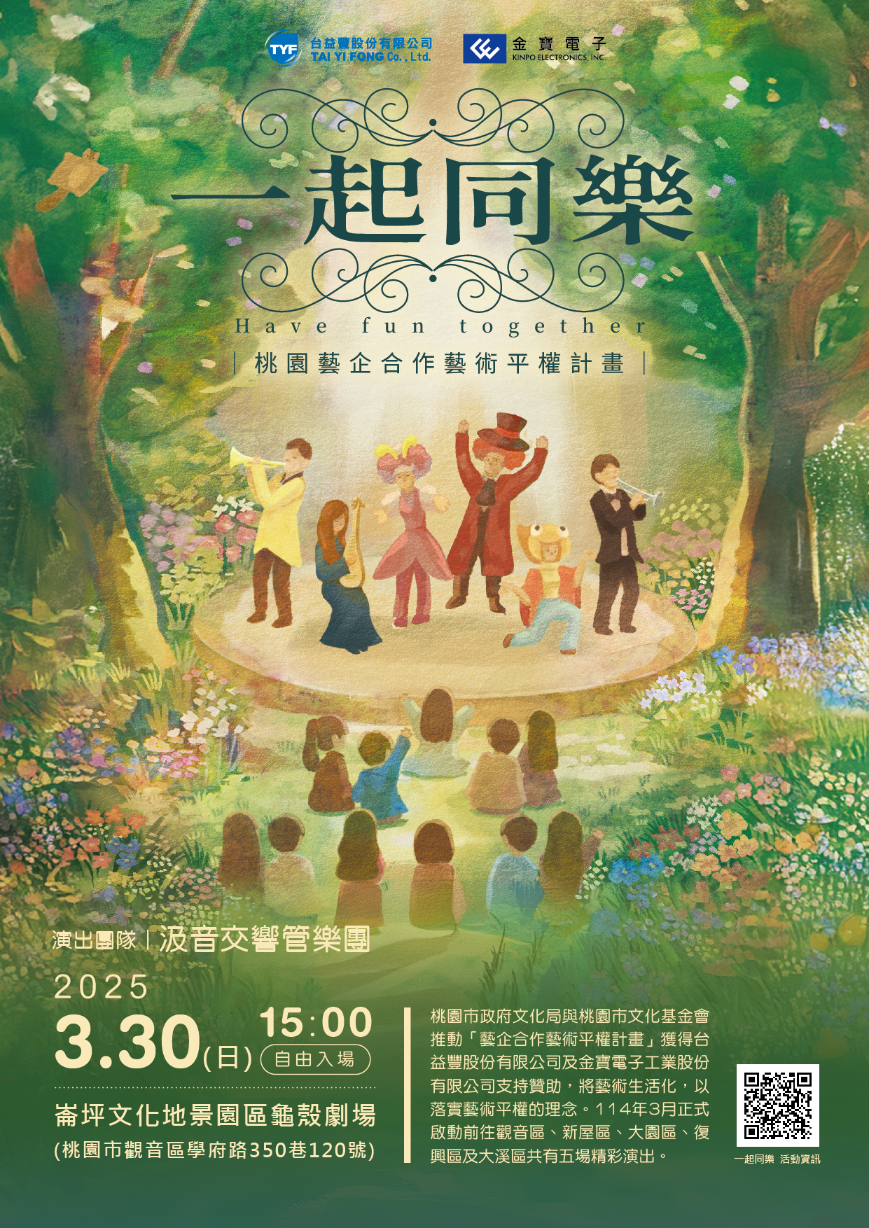 | 一、 | 本活動預定於114年3月30日(星期日)下午3時,邀請「汲音交響管樂團」於觀音區崙坪文化地景園區龜殼劇場(桃園市觀音區學府路350巷120號)辦理演出。 |