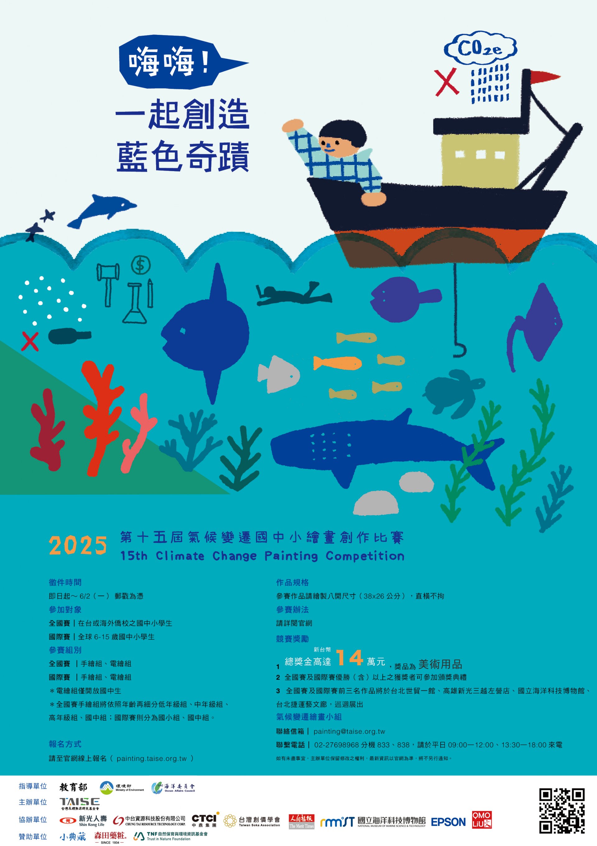 二、 第15屆「氣候變遷國中小繪畫創作比賽」為呼應聯合國永續發展目標(SDGs)的第14項「保育海洋生態」,以「嗨海!一起創造藍色奇蹟」為主題,一起投入保育與永續的實踐,讓親海、知海、愛海三大海洋素養,遍及全球的海洋公民。此繪畫比賽也呼應第13項,採取氣候行動並提升大眾相關意識。