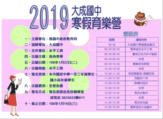 (三)報名表家長簽名後請於108年1月16日(星期三)前傳真至大成國中輔導室資料組,本校得以傳真先後作為錄取依據,另本校有考量學校辦理現狀審核是否錄取之權責。錄取名單將於開課前公告於大成國中首頁。