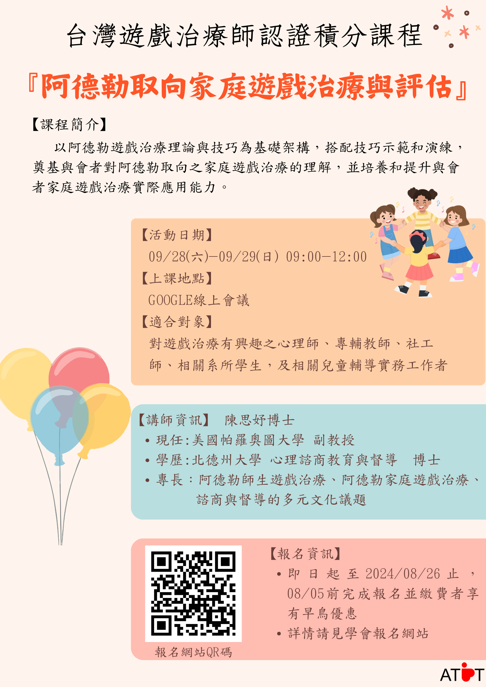 主旨: 台灣遊戲治療學會將於113年9月28、29日舉辦【2024台灣遊戲治療師認證積分課程】阿德勒取向家庭遊戲治療與評估,詳情如說明及附件。