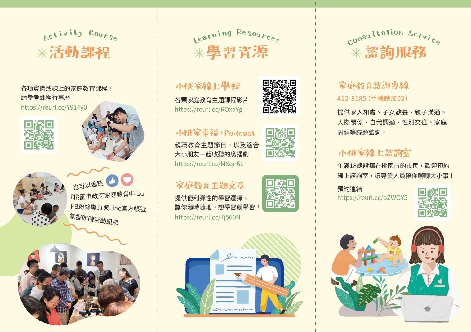 (一)    小桃家線上諮詢室:提供年滿18歲以上之桃園市民每月一次之線上諮詢服務,倘有親職教養、家人關係及家庭資源管理議題,歡迎逕至本中心網站申請及預約(預約連結:https://reurl.cc/oZWOY5)。
