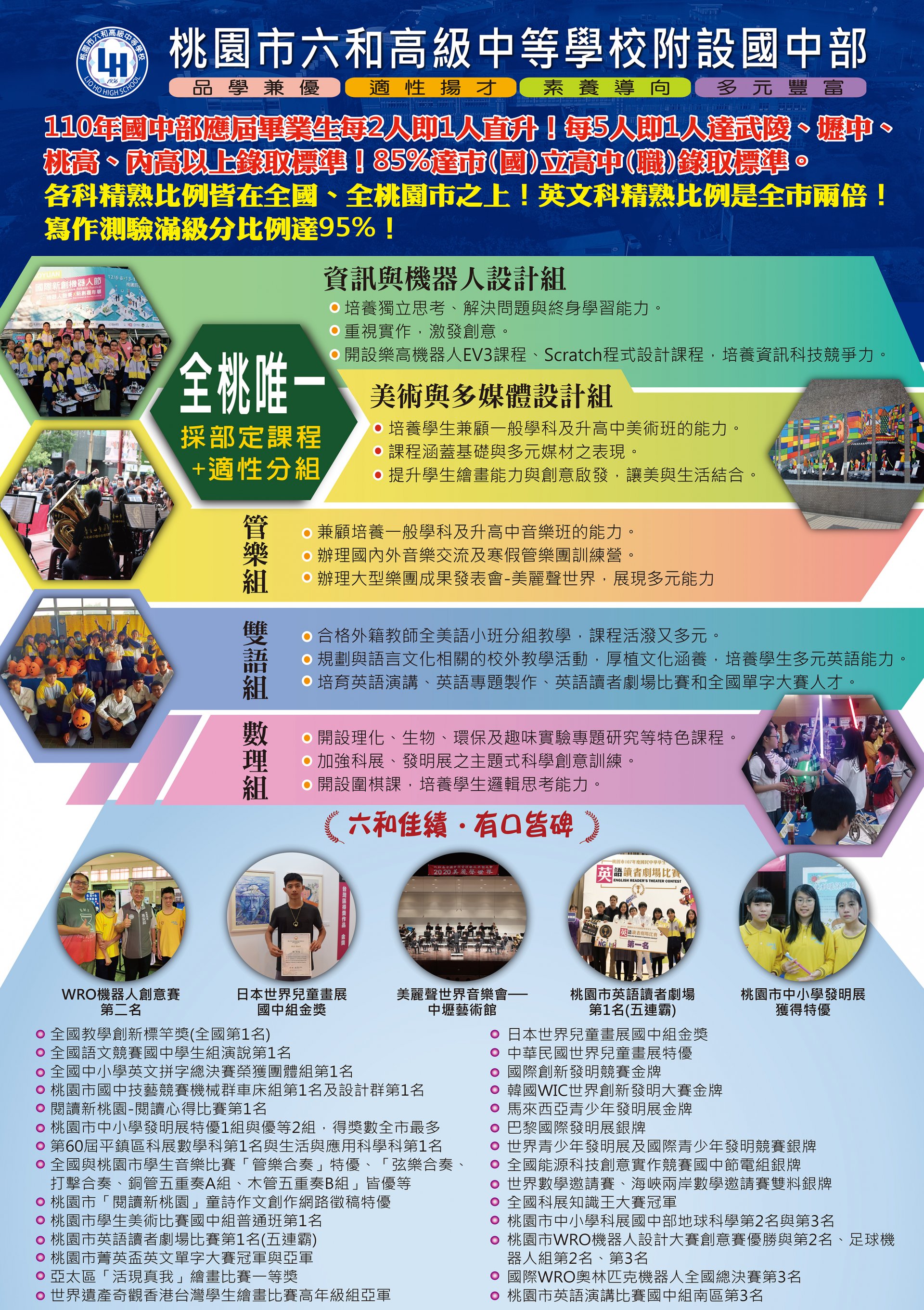 本校附設國中部,是全桃園唯一採部定課程與適性分組的學校,開設資訊與機器人設計組、美術與多媒體設計組、管樂組、雙語組及數理組等五組特色課程。
