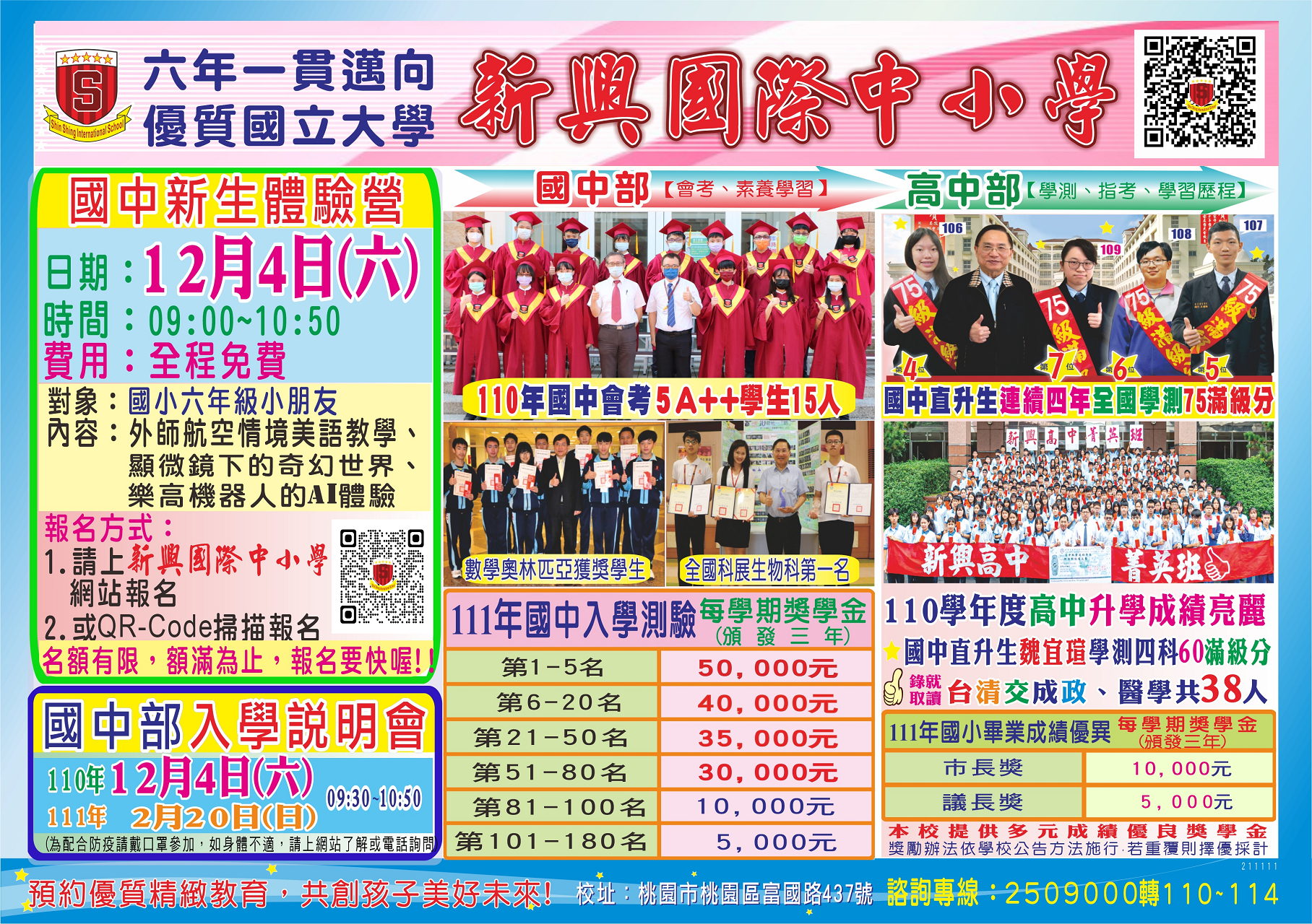 | 二、 | 本校同時於110年12月4日(六)早上09:30~10:50辦理國中新生入學說明會,歡迎家長蒞校參加。 |