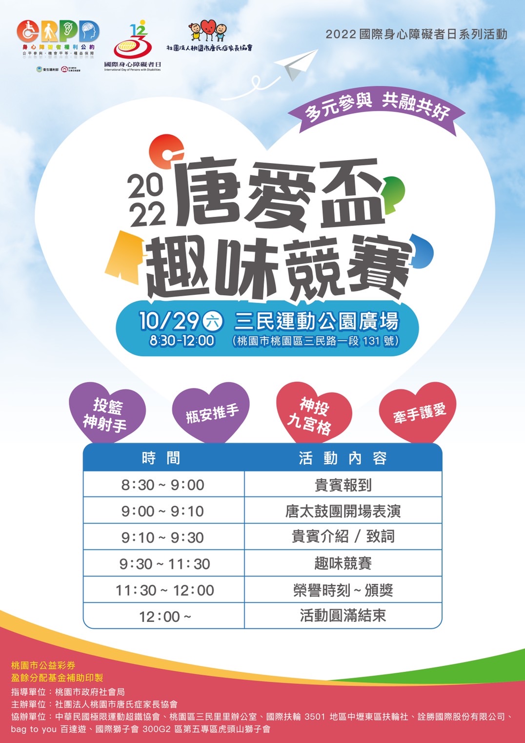 主旨:檢送社團法人桃園市唐氏症家長協會辦理2022國際身心障礙者日系列活動「多元參與共融共好~唐愛盃趣味競賽活動」活動海報及報名簡章1份,請查照。