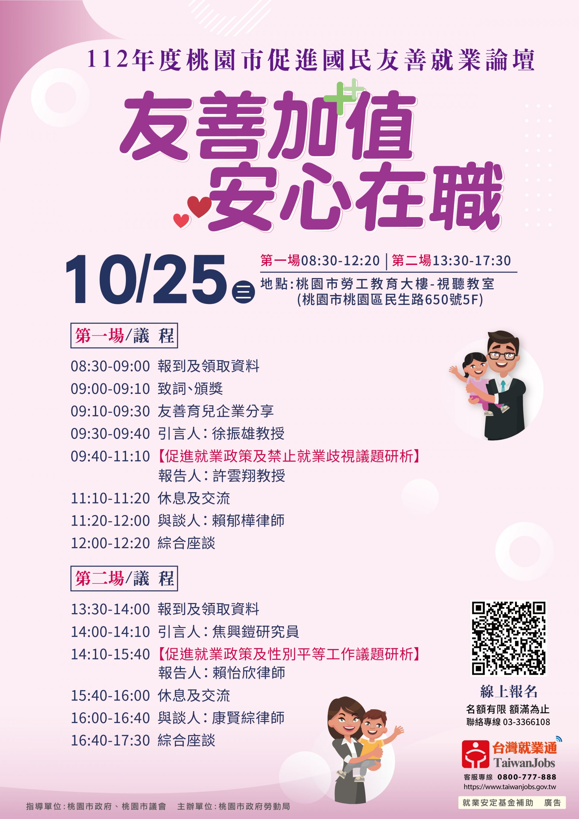轉知桃園市政府辦理112年度促進國民友善就業論壇(禁止就業歧視及性別平等工作法修正),本案採網路報名請參閱。