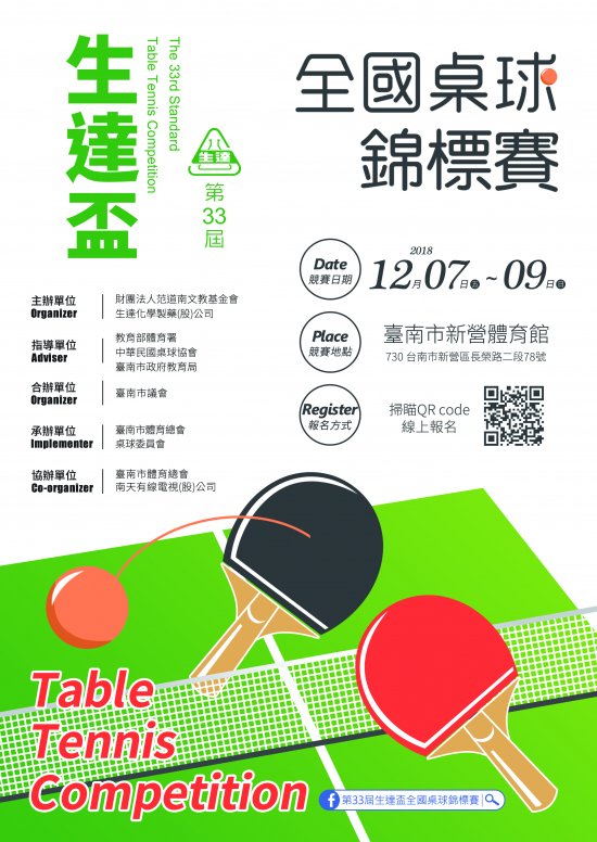 主旨:轉知財團法人范道南文教基金會辦理「第三十三屆「生達盃」全國桌球錦標賽」一案,請踴躍報名參加,請查照。 說明: 一、依據財團法人范道南文教基金會107年8月29日南基字第1070800008號函辦理。 二、本案相關訊息如下: (一)活動時間:107年12月7日至9日。 (二)活動地點:臺南市新營體育館 (臺南市新營區長榮路二段78號)。 三、檢附競賽規程1份。