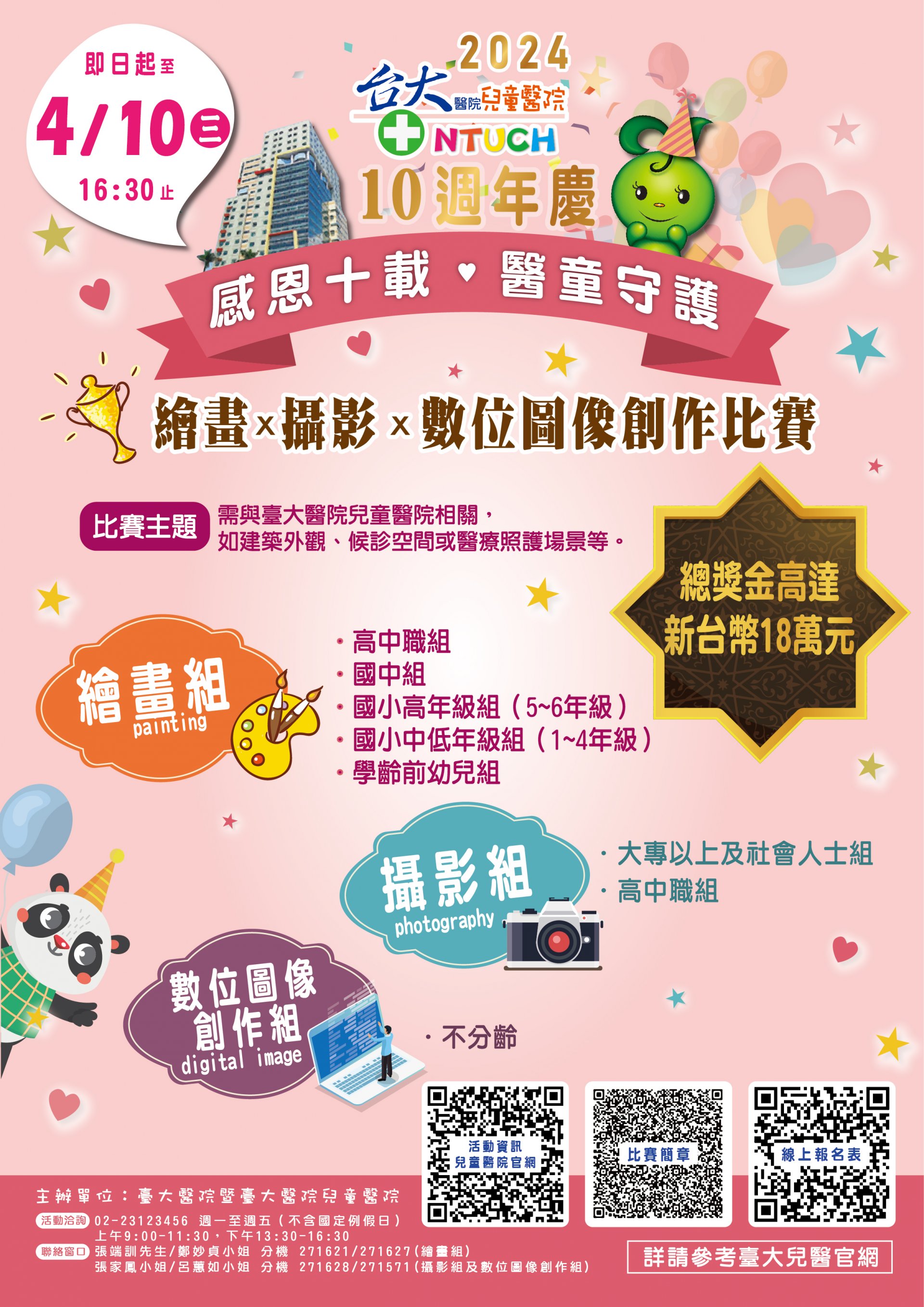 主旨: | 有關國立臺灣大學醫學院附設醫院暨兒童醫院辦理「2024臺大醫院兒童醫院10週年慶-感恩十載.醫童守護-繪畫、攝影與數位創作比賽」,請貴校轉知學生踴躍報名參加,請查照。 |