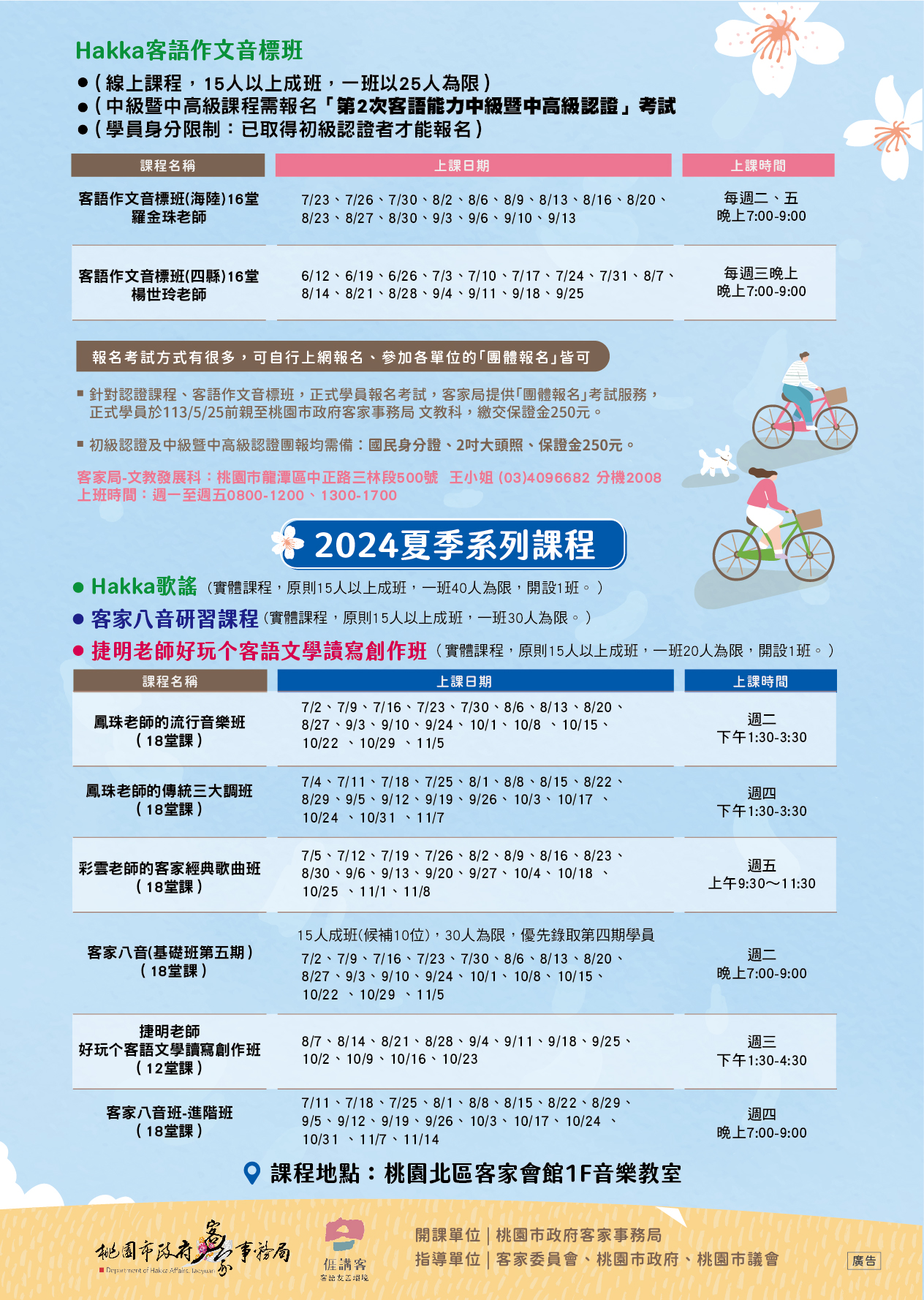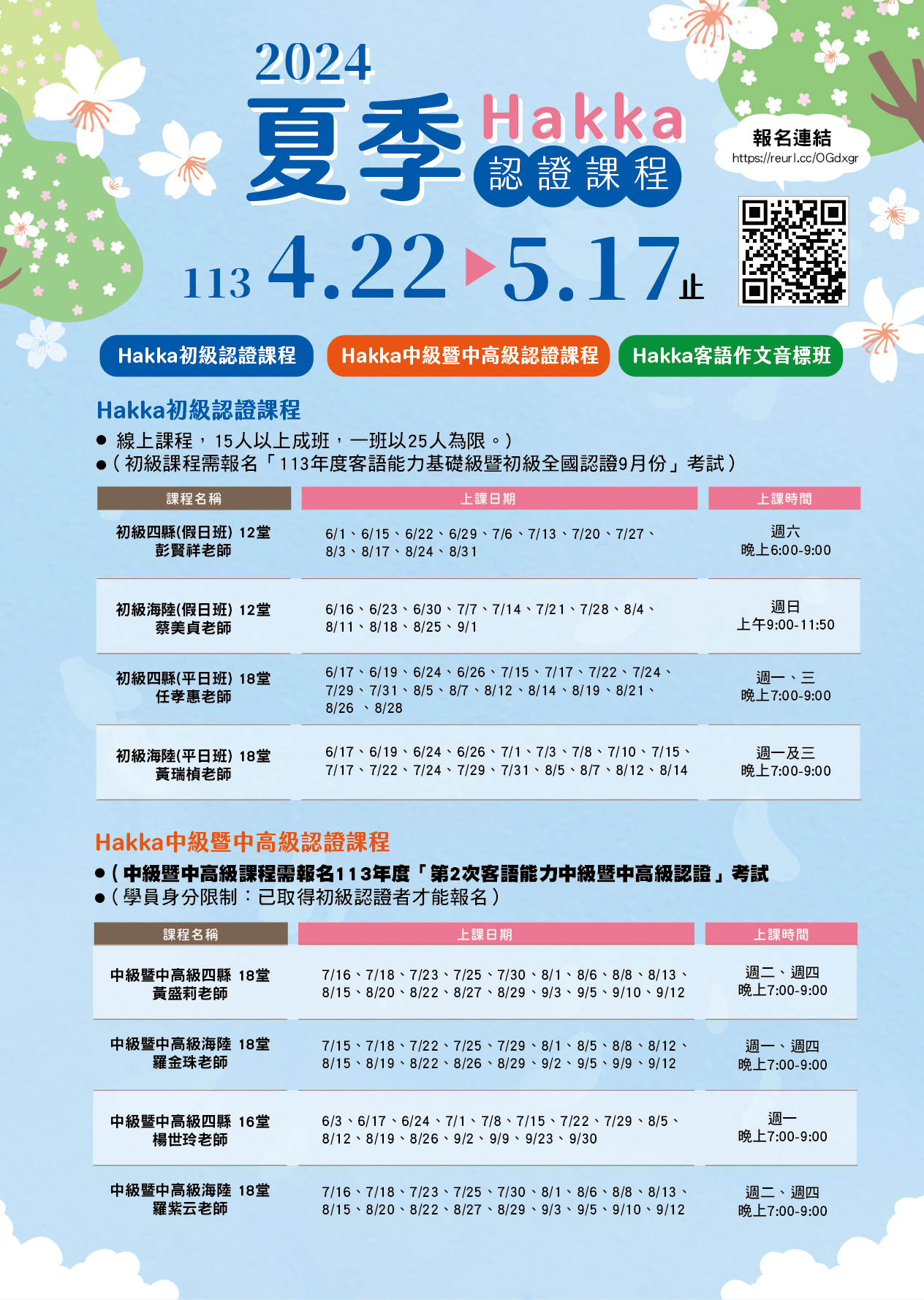 旨揭報名日期為113年4月22日至5月17日,文宣電子檔相關資訊可至桃園市政府客家事務局FB(