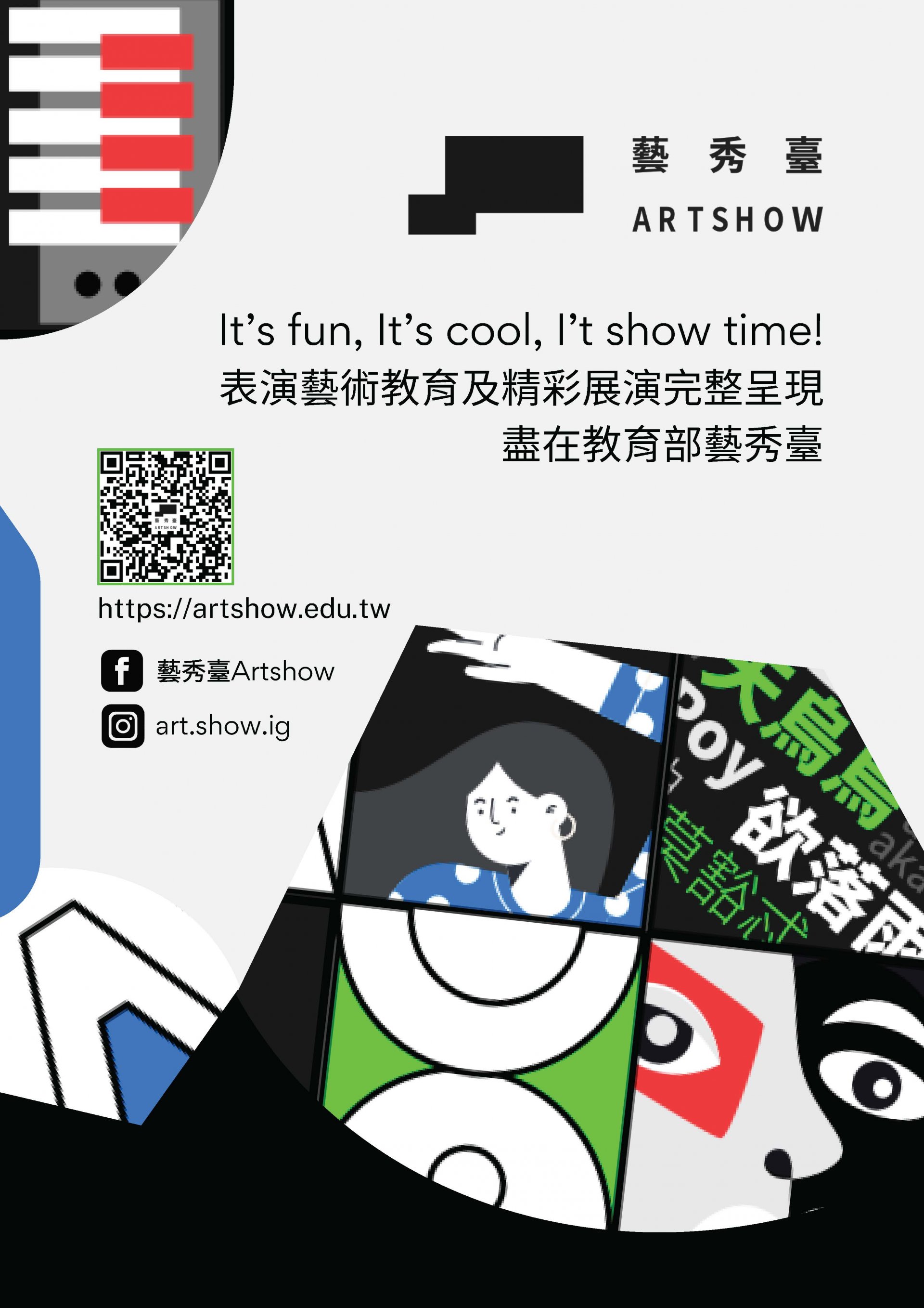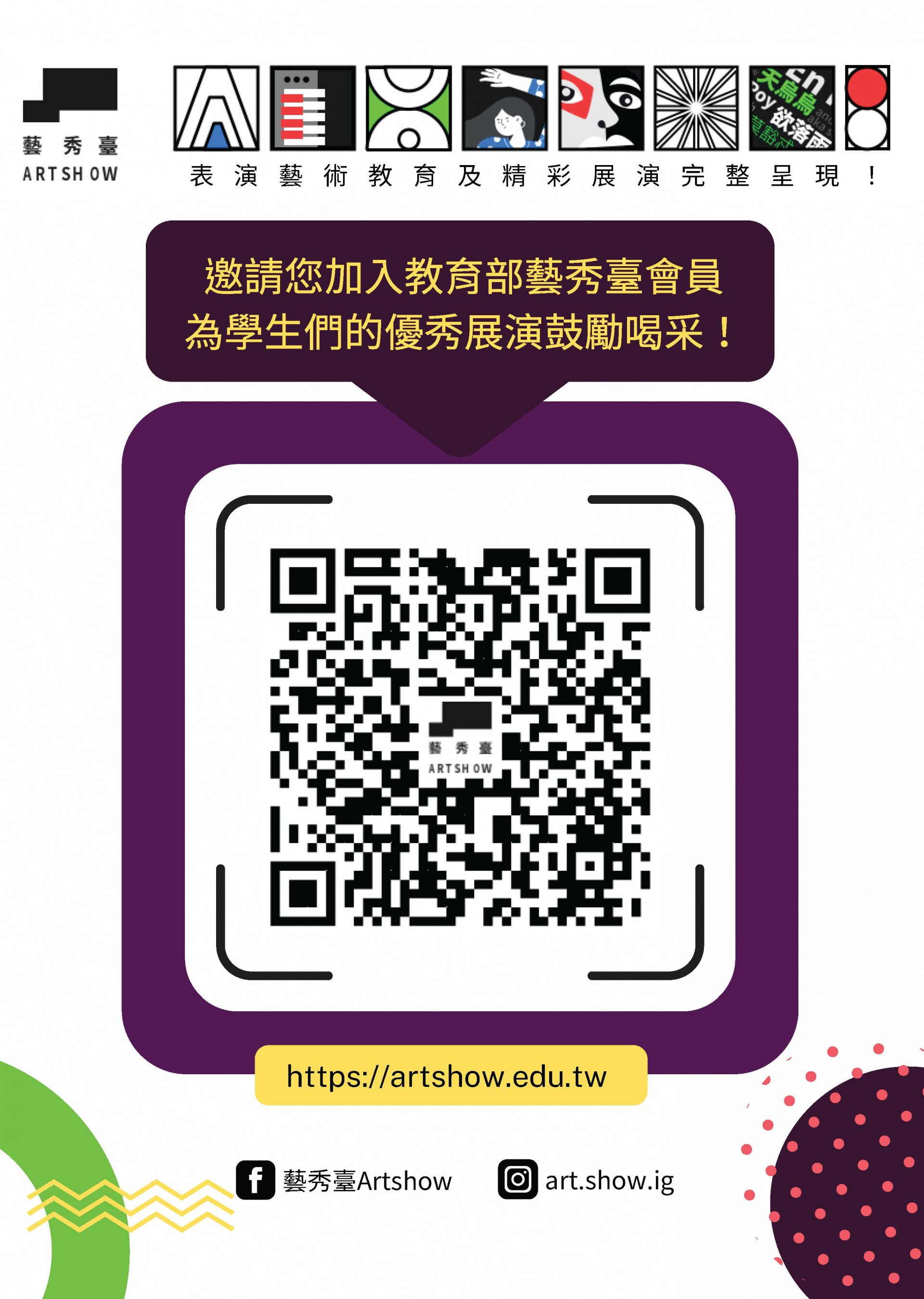 | 四、 | 「藝秀臺」將持續提供優質展演及表演藝術教育推廣內容,更多精采影片,請至「藝秀臺」網站,或至「藝秀臺」臉書粉絲專頁:臉書搜尋「藝秀臺ArtShow」、官方IG:搜尋「art.show.ig」關注即時訊息。 |