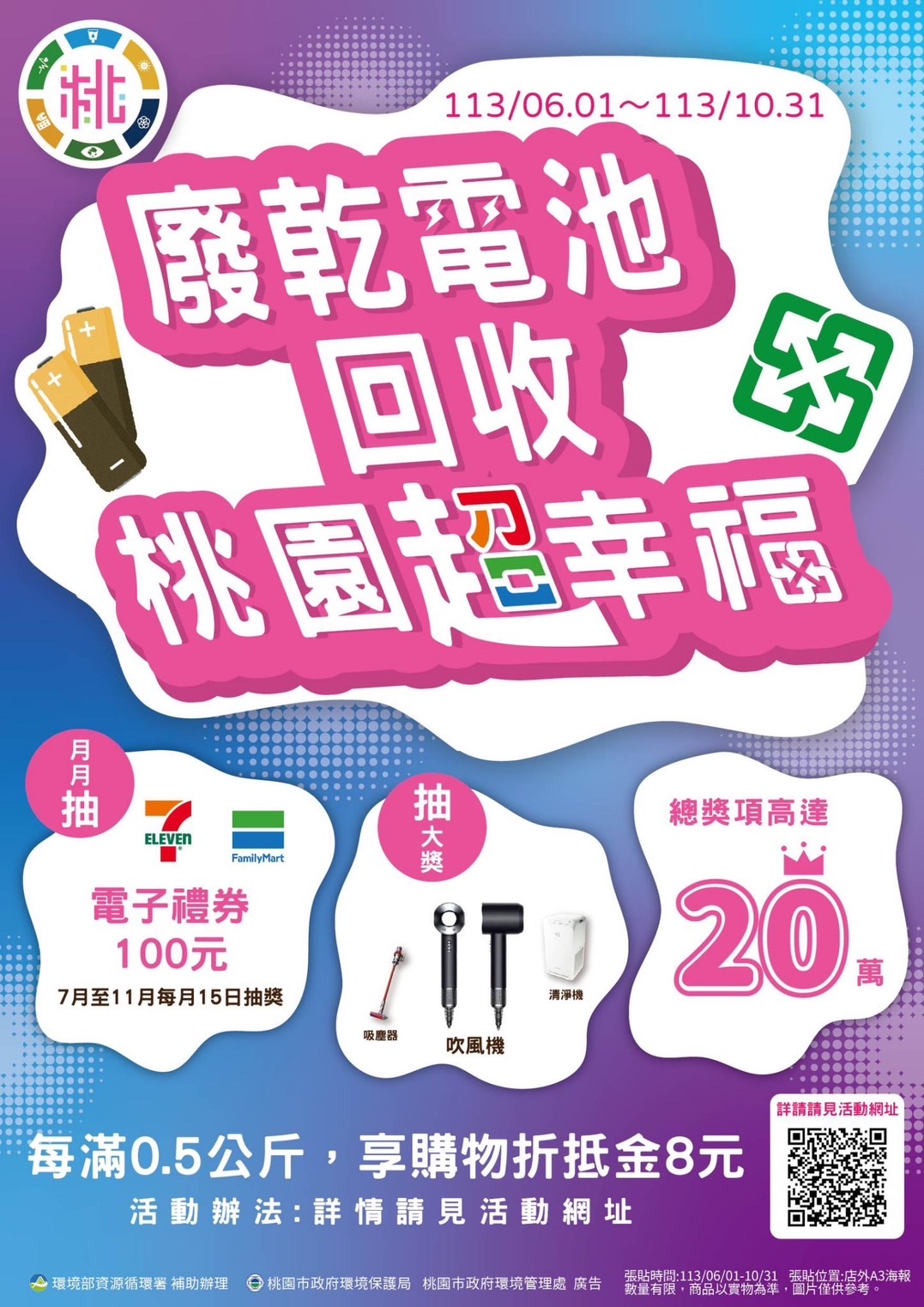 主旨: 有關本局於113年6月1日起至10月31日期間,結合統一超商及全家便利商店辦理「廢乾電池回收 桃園超幸福」廢乾電池回收加碼活動案,惠請廣為宣傳,請查照。