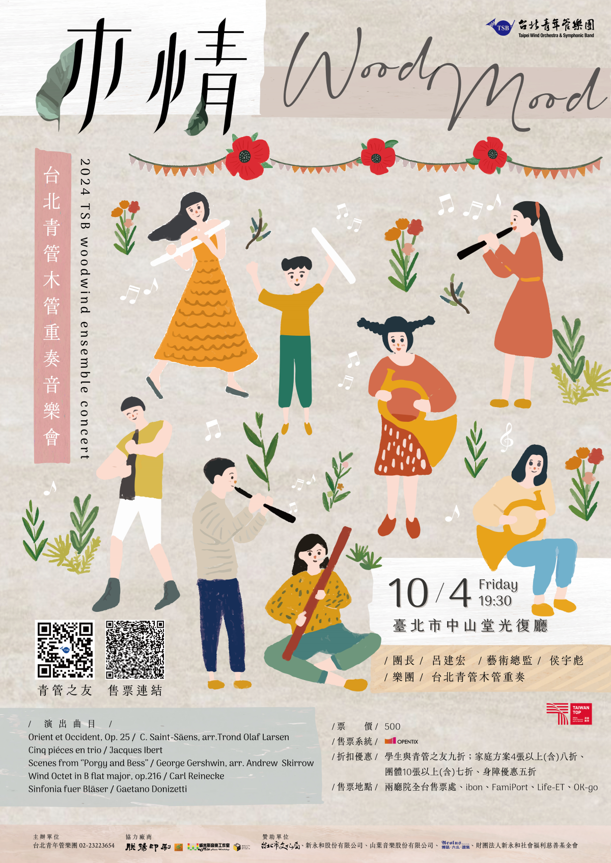 主旨: 檢送「2024台北青管木管重奏音樂會《木情》」海報1份,敬請協助轉知轄屬學校、校內師生並鼓勵踴躍參與,至紉公誼,請查照。