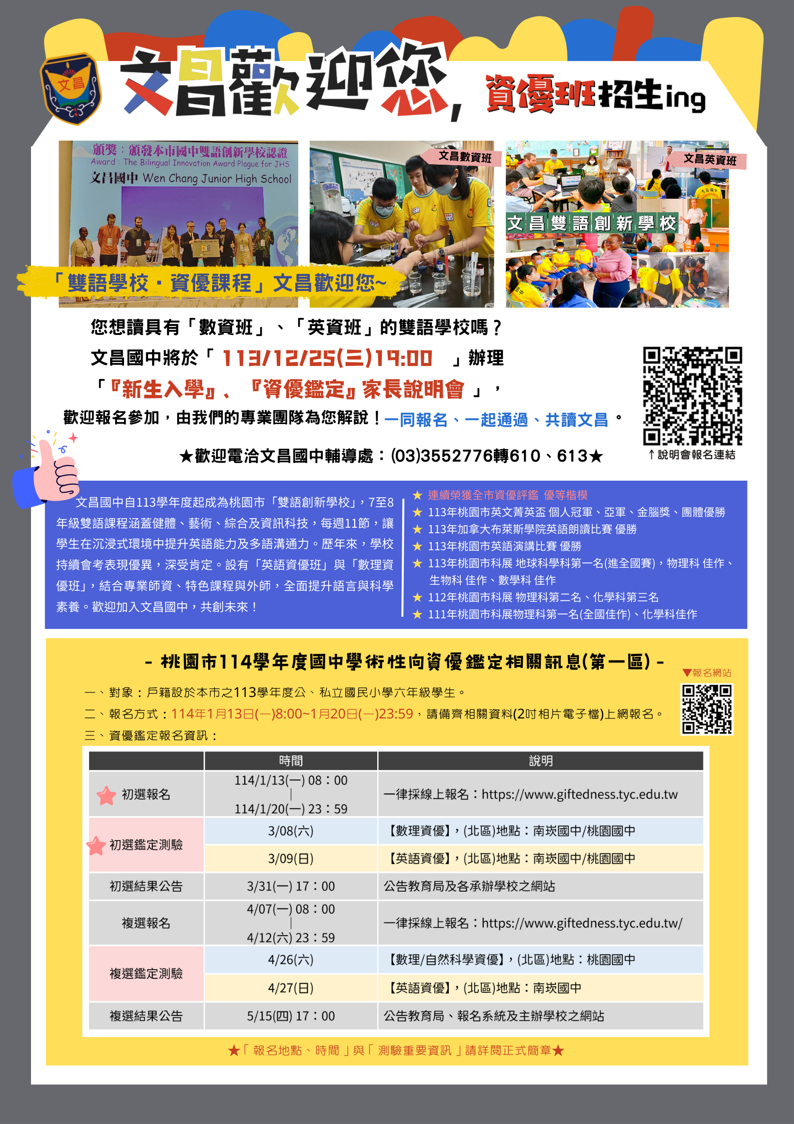 主旨:文昌國中辦理114學年度國民中學資賦優異學生鑑定家長說明會及數理資優營隊訊息,公告相關事宜。