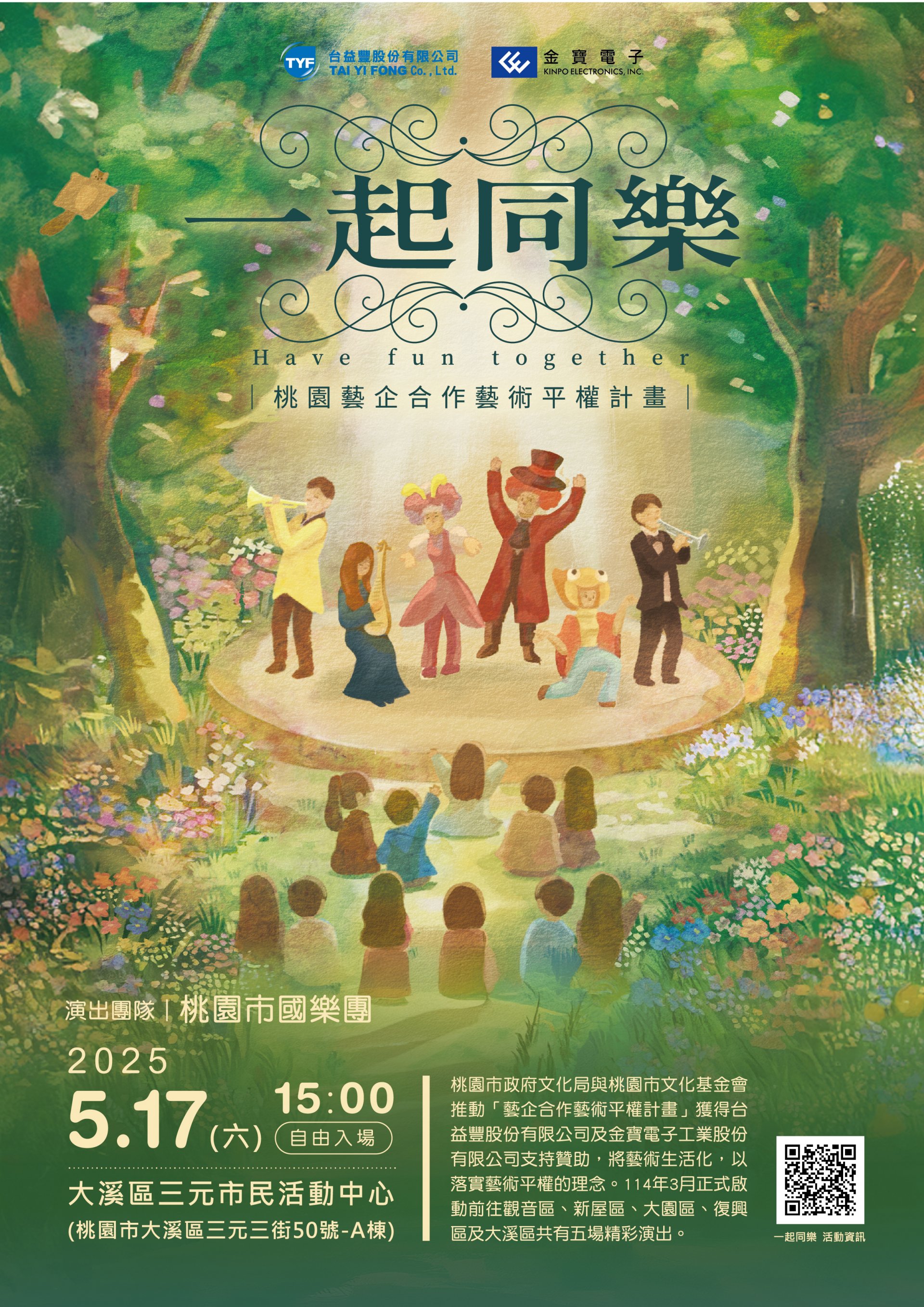 一、 | 本活動預定於114年5月17日(星期六)下午3時,邀請「桃園市國樂團」於大溪區三元市民活動中心(桃園市大溪區三元三街50號-A棟)辦理演出。 |