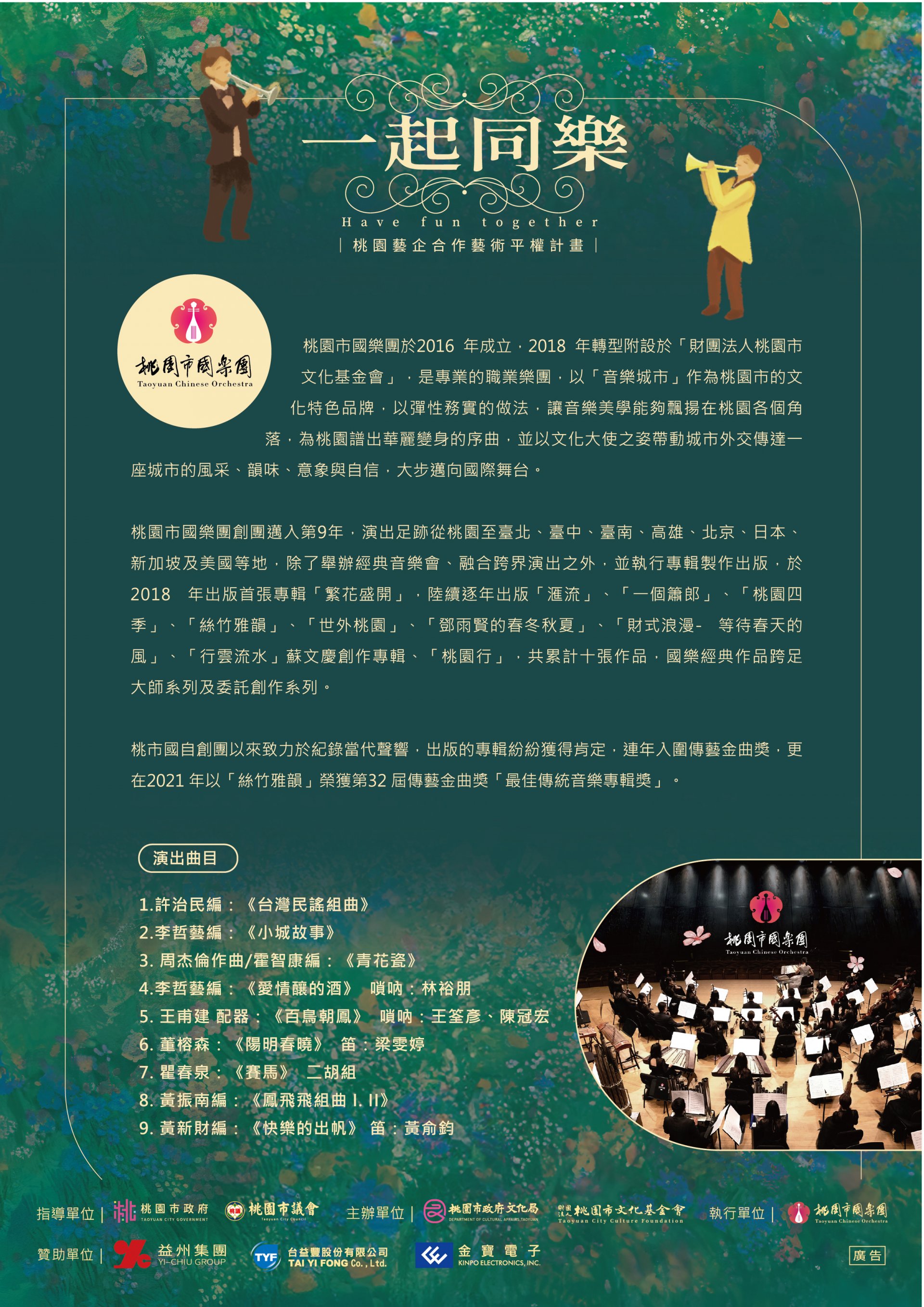主旨: | 檢送本局「一起同樂-桃園藝企合作藝術平權計畫」大溪場社區巡演活動文宣,請惠予協助宣傳周知,至紉公誼。 |