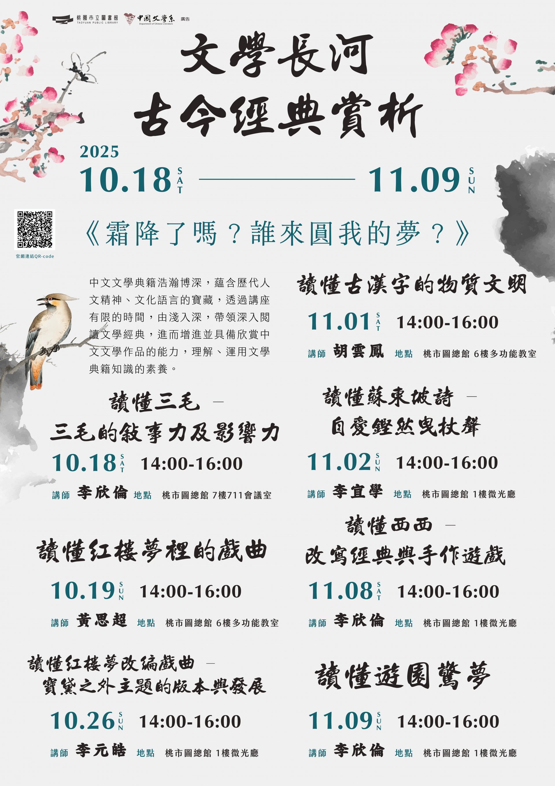 三、本館將於114年9月6日至11月9日辦理本系列講座,並自114年8月18日上午8時起開放報名,額滿為止。全程參與之教師可申請2小時教師研習時數。