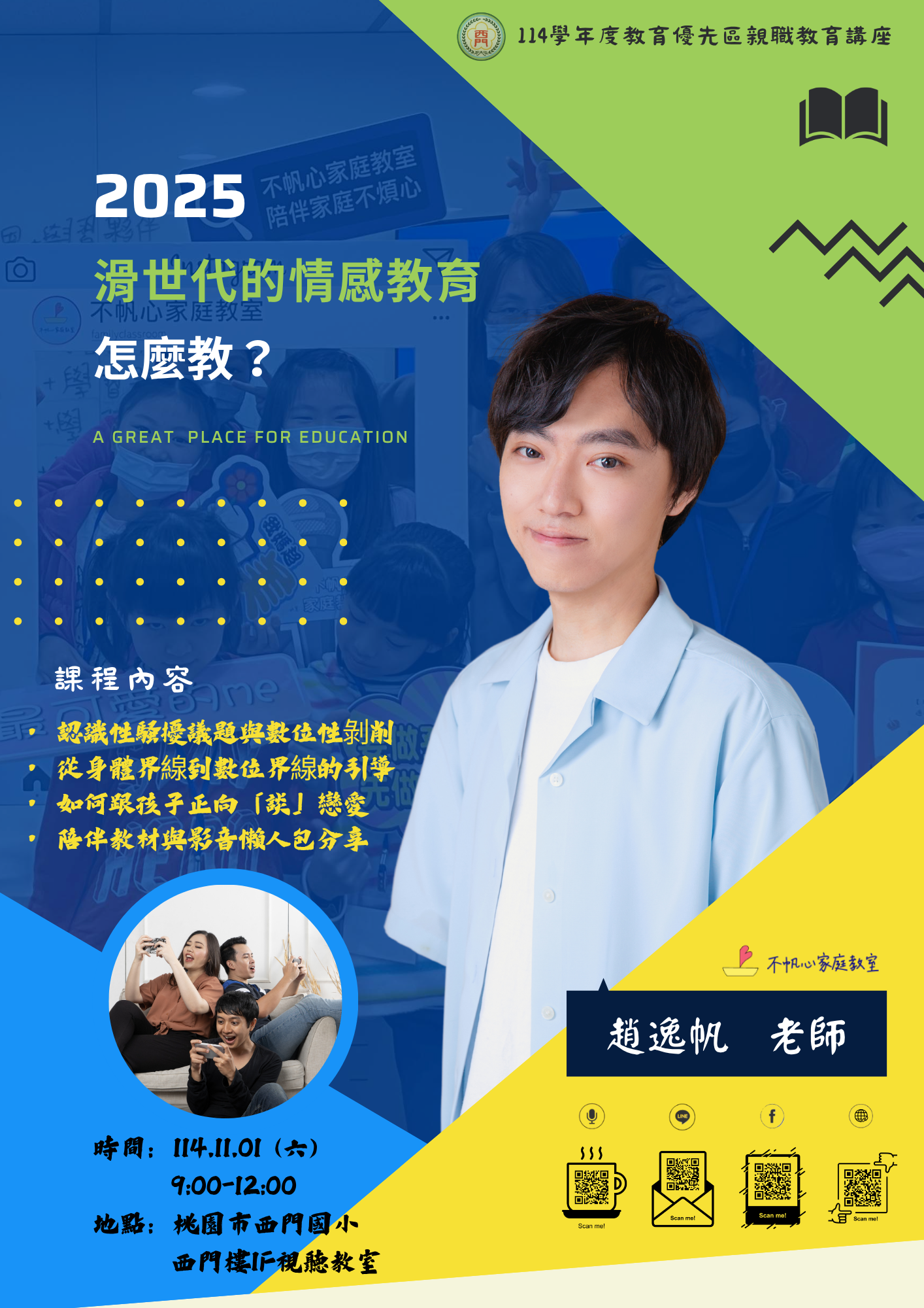 主旨: 西門國小 辦理114學年度教育優先區親職教育講座「滑世代的情感教育,怎麼教?」,歡迎教職員、家長及社區人士踴躍參加。