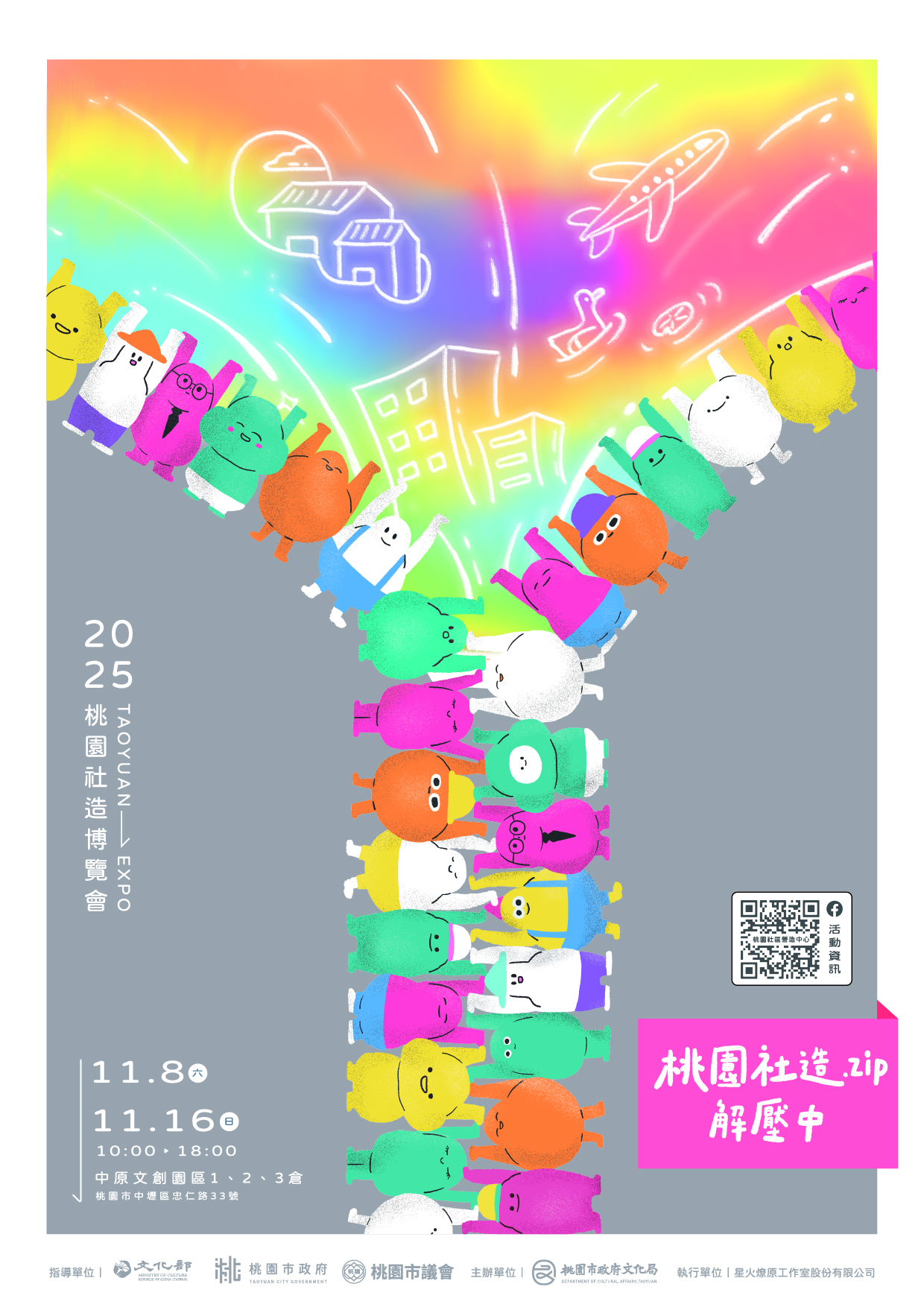 | 一、 | 為呈現桃園市推動社區總體營造成果,邀請各單位夥伴一同體驗桃園社造「解壓縮」的瞬間,一次展開市府跨局處、區公所及社造點等,超過90個單位的行動方案與成果,完整呈現桃園文化的流動、交織與共生。 |