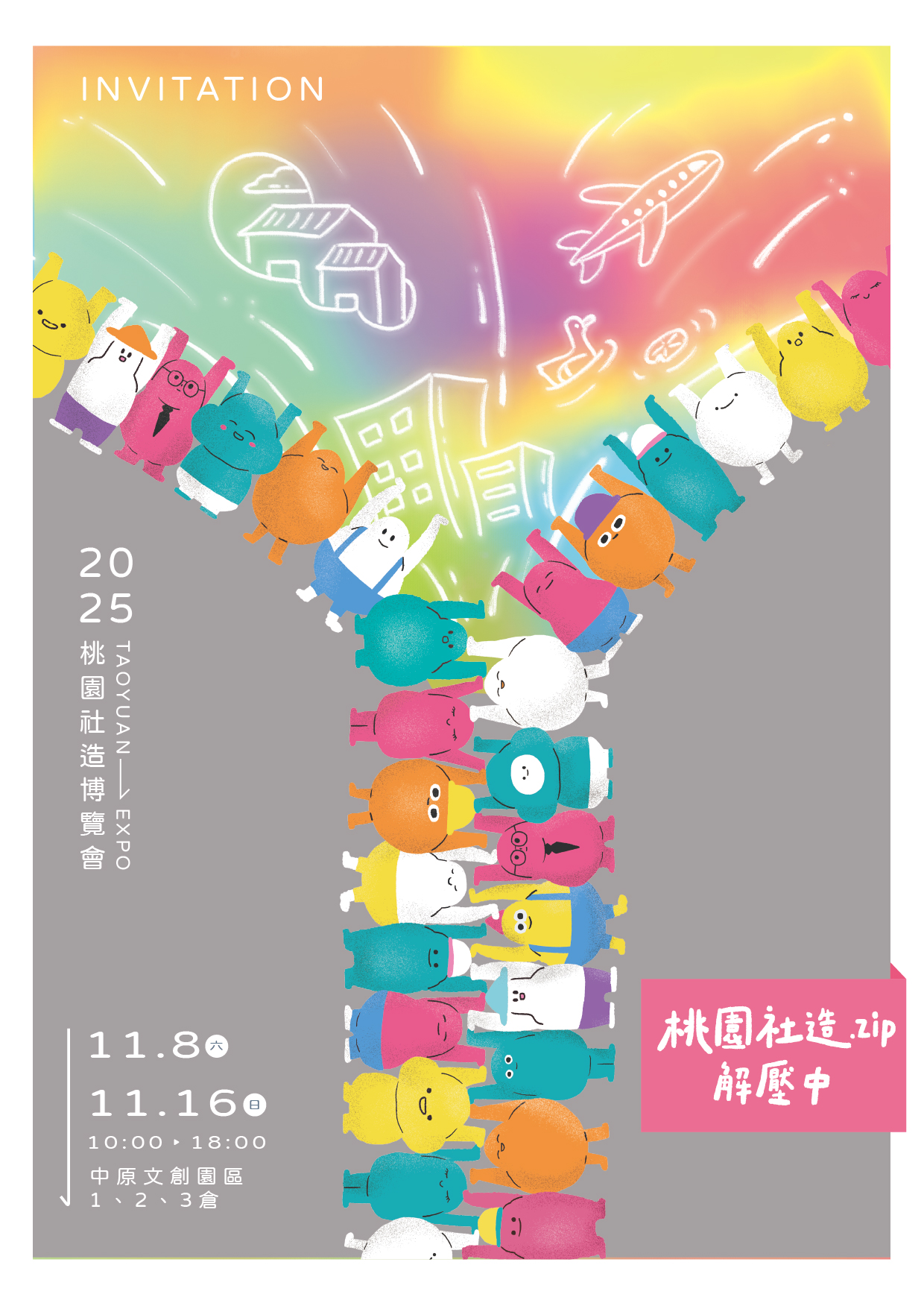 | 主旨: | 檢送本局辦理「2025桃園社造博覽會-桃園社造.zip解壓中」活動海報及開幕式邀請卡各1份,敬請貴單位協助宣傳並踴躍參加,請查照。 |