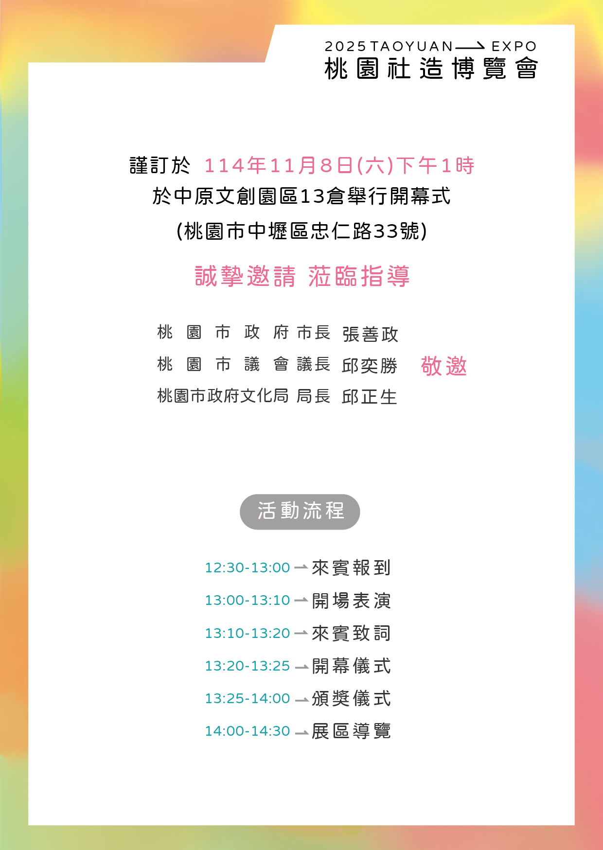 | (一) | 開幕式:114年11月8日(星期六)下午1時,活動地點為中原文創園區13倉。 |