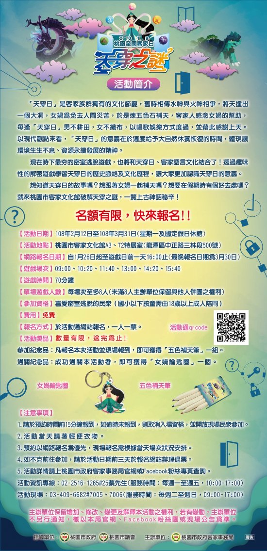 為增進本市學子對「全國客家日─天穿日」之認識,並促進親師生互動,本局辦理「2019桃園全國客家日─天穿之謎」密室逃脫暨展覽活動,活動資訊如下: