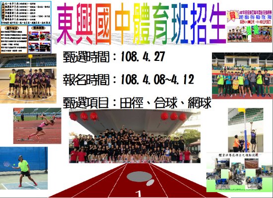 主旨:檢送桃園市立東興國民中學「108學年度體育班新生(含轉學.轉班生)入學甄選簡章」,請惠予公告,協助張貼並將相關資訊轉知貴校學生,敬請查照。