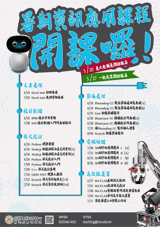 臺灣大學計算機及資訊網路中心(以下簡稱本中心)於108年6月24日起辦理暑期資訊應用課程,課程詳細資訊與報名網址請至該中心網站查詢