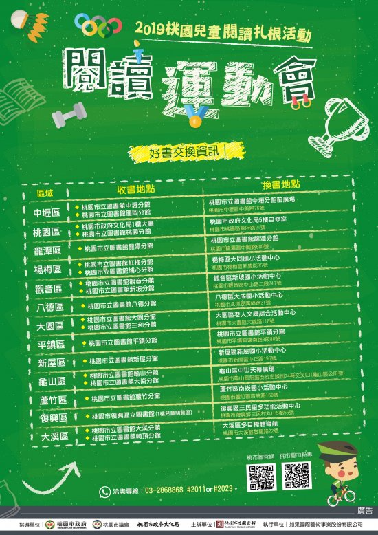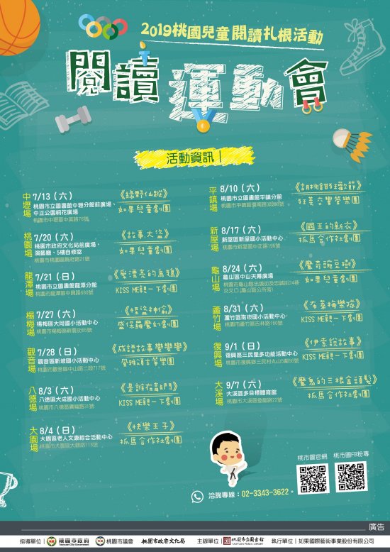 四、相關活動問題歡迎至本活動官方網站「2019閱讀運動會」(https://www.2019readingfestival.com/)洽詢,或電洽03-2868868#2023。
