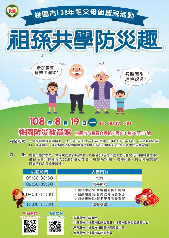 一、依據「桃園市108年祖父母節慶祝活動-祖孫共學防災趣實施計畫」辦理。