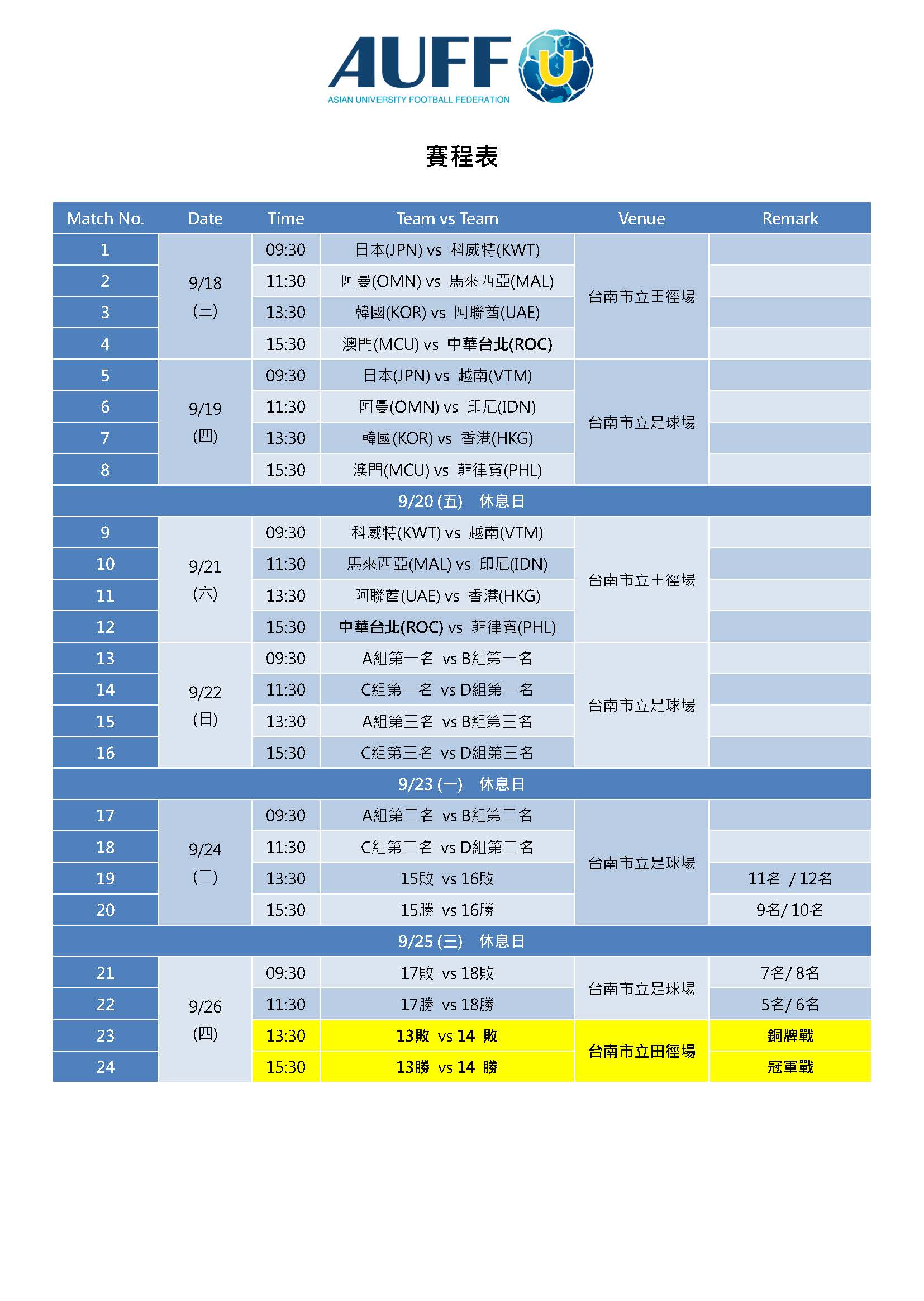 主旨:檢送臺南市政府辦理「2019亞洲大學足球錦標賽」活動海報、賽程表及索票資訊各1份,惠請協助公告,請查照。 說明: 一、依據臺南市政府108年8月27日府教體處全字第1081003581號函辦理。 二、活動海報、賽程表及索票資訊詳如附件,或請逕洽臺南市政府相關活動事宜。