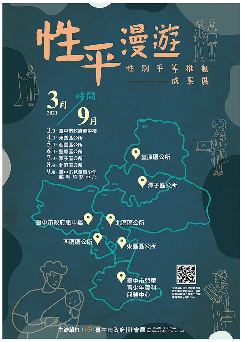 | 二、 | 為推廣臺中市政府各機關及各區公所推動性別平等之成果,提升性別平等知能,臺中市政府於110年3月至9月辦理旨揭活動,3月1日起以臺灣大道市政大樓惠中樓中庭為特展起點,逐月依序至東區區公所、西區區公所、豐原區公所、潭子區公所、北區區公所及臺中市兒童青少年福利服務中心等處巡迴展出,每處展期各為1個月。 |
