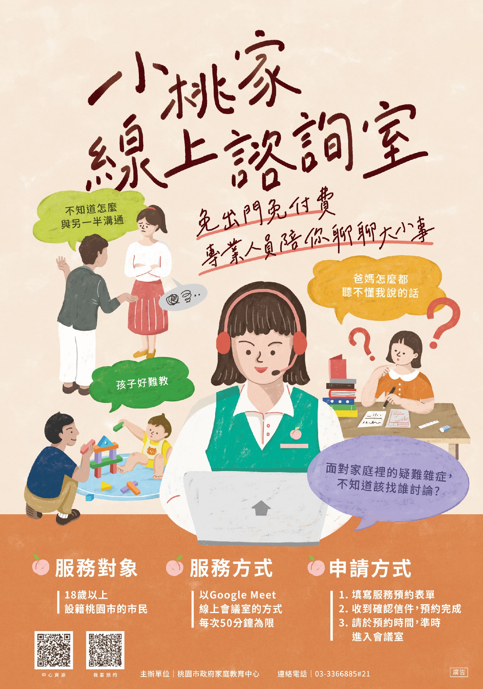 | 一、 | 為協助有家庭教育需求者,透過個別化之家庭教育線上諮詢服務,增進家人關係與家庭功能,本中心辦理「小桃家線上諮詢室」,相關資訊如下: |