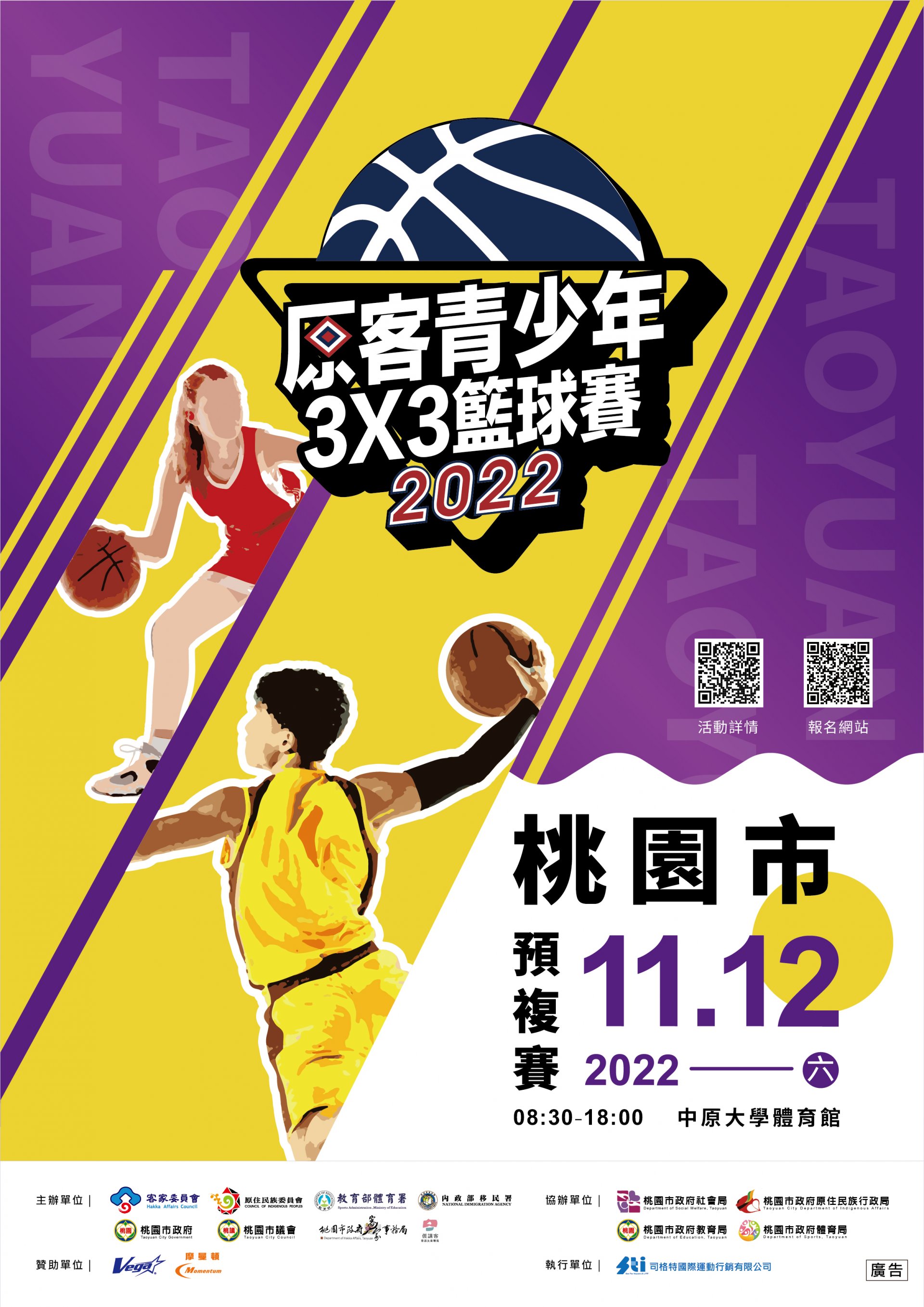 | 一、 | 為促進客家及原住民族群文化共融交流,鼓勵客家及原住民青少年「以球會友,族群交流」,提升客家文化及原住民族能見度及鼓勵多元族群參與,將於111年11月12日(星期六)於本市中原大學體育館舉辦「2022原客青少年三對三籃球賽之桃園市預、複賽」。 |