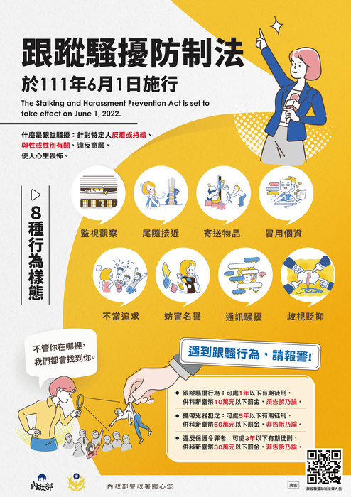 說明: 一、依據教育部111年6月13日臺教學(三)字第1110054882號函辦理。 二、跟蹤騷擾防制法於111年6月1日施行,經彙整內政部、法務部、衛生福利部、勞動部及教育部相關宣導資源,請加強對學生、教師及民眾之宣導,以保護個人身心安全、行動自由、生活私密領域及資訊隱私,免於受到跟蹤騷擾行為侵擾,維護個人人格尊嚴。
