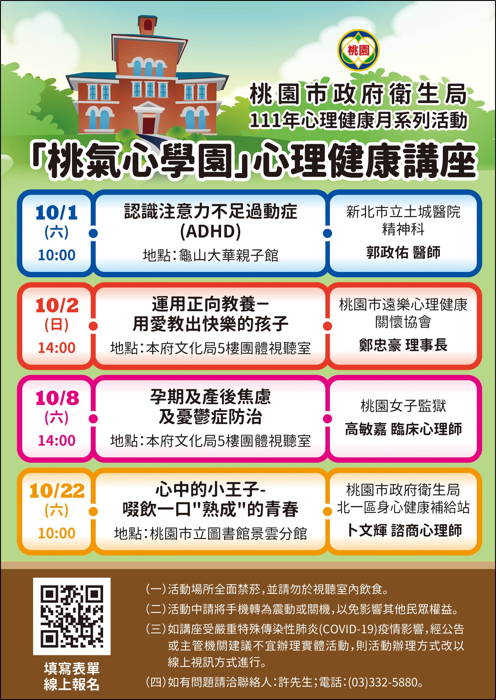 主旨: 檢送本局辦理111年心理健康月系列活動-「桃氣心學園」心理健康講座活動,請查照。