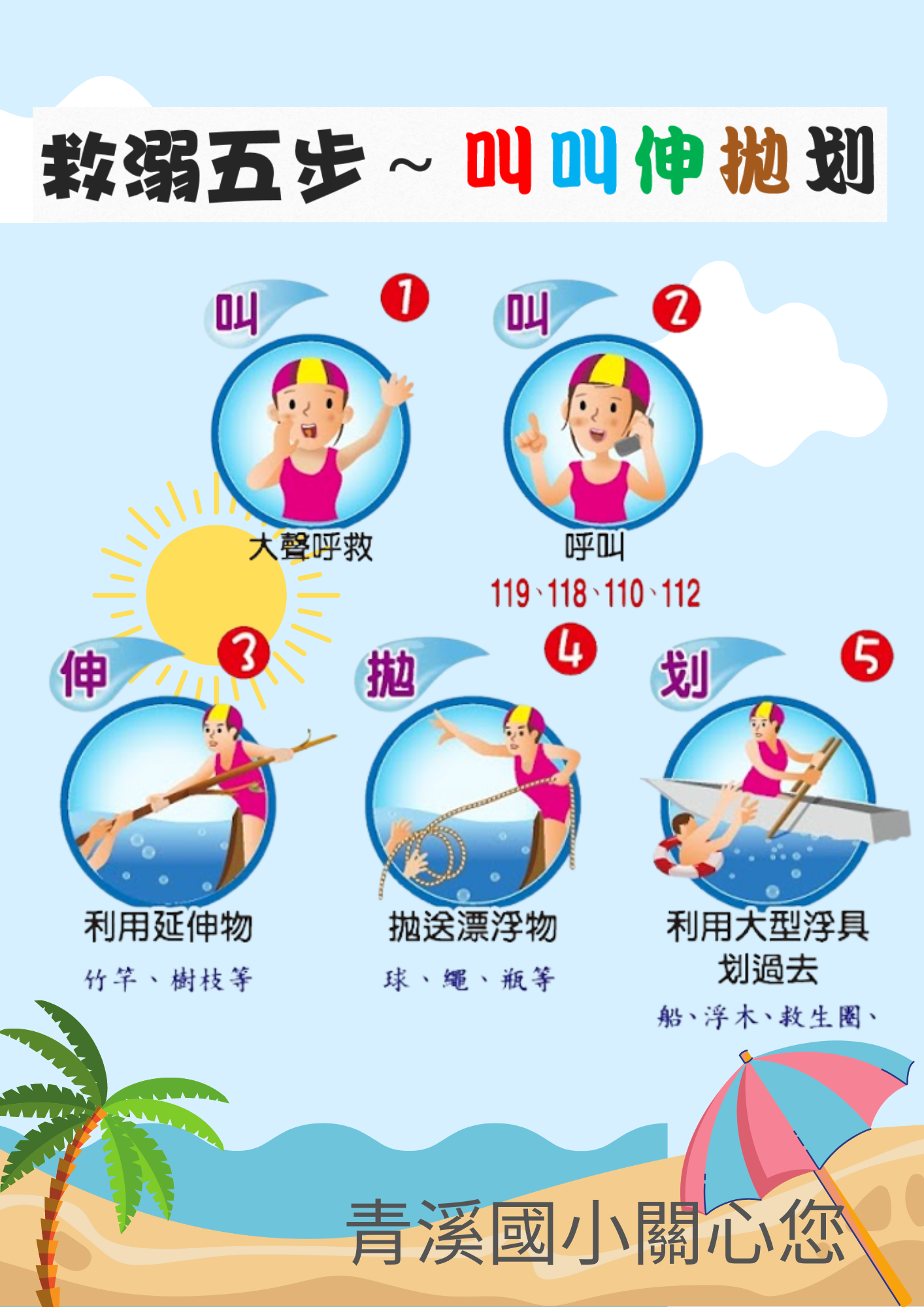 二、熟記「水中自救4招」、「救溺五步-叫叫伸拋划」與「防溺十招」等水域安全觀念,請下載附件參閱。