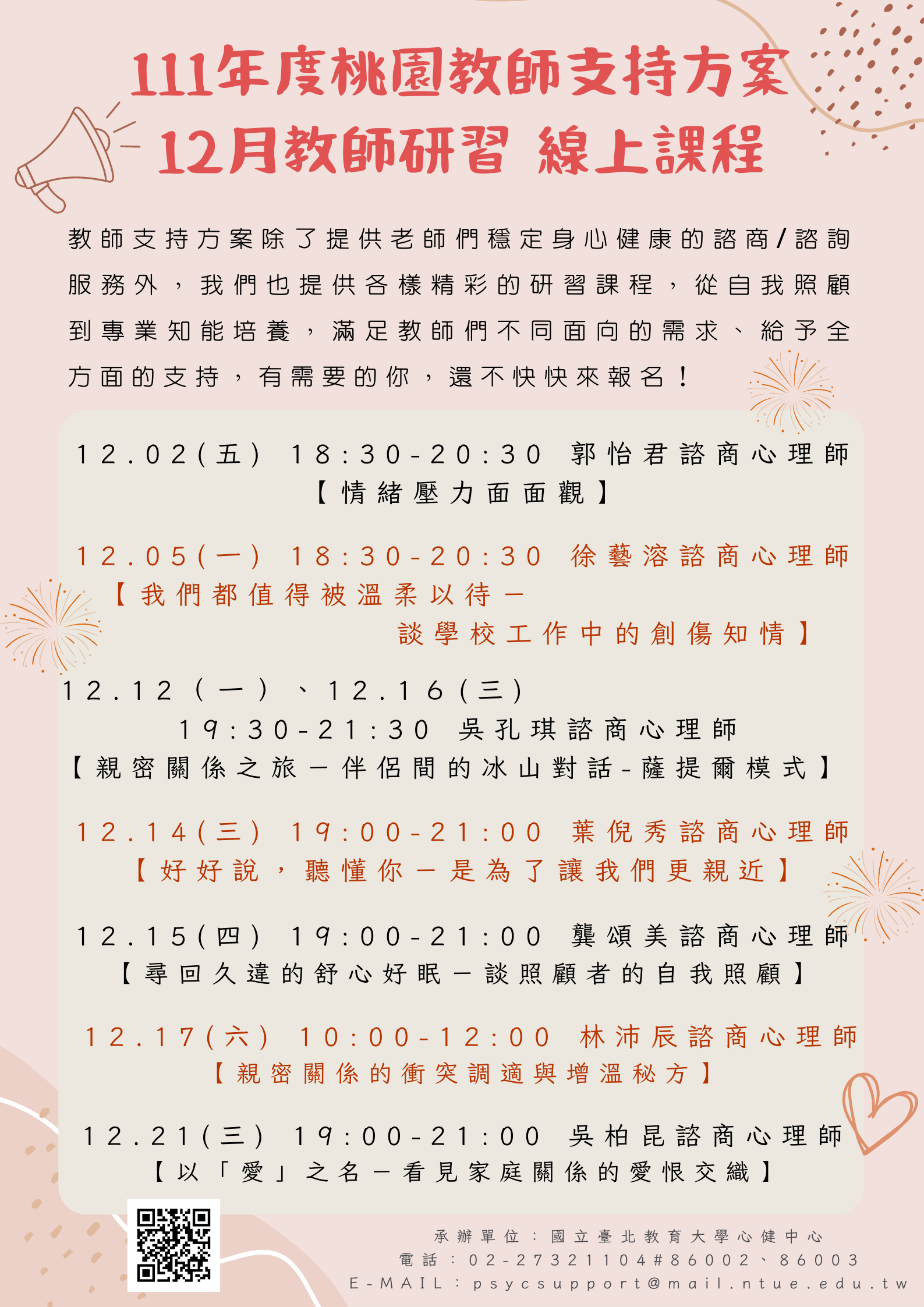 二、 為提供本市教師全面性的服務資源及促進自我覺察、自我照顧、情緒調節,以達身心健康之效,國立臺北教育大學(心 理諮商暨健康促進研究中心)自111年12月2日至12月21日止 ,共規劃7場教師研習線上講座。請轉知所屬並參考附件所列之 QR Code 進行報名。(報名網址:https://reurl.cc/101DN9)