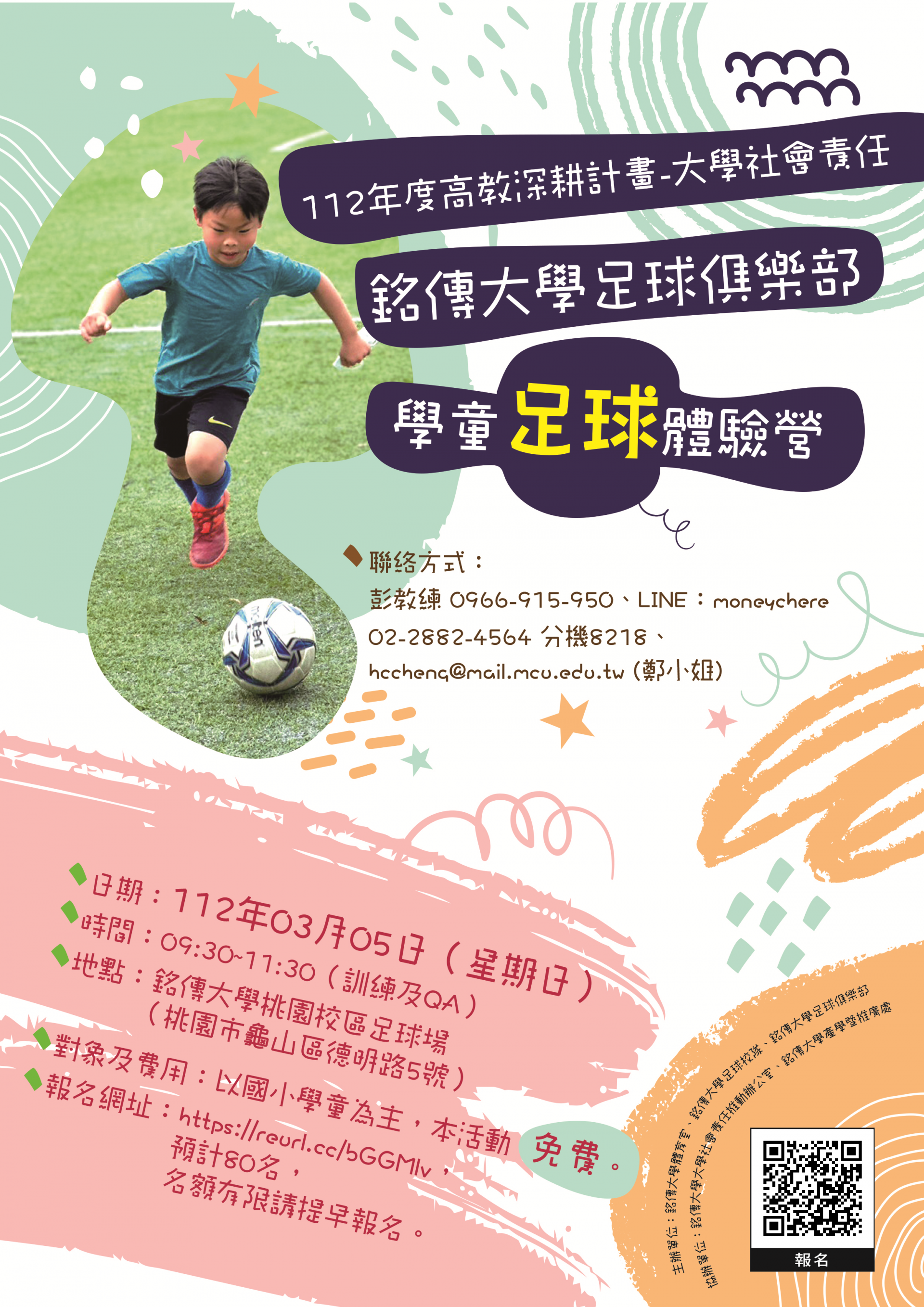 | 主旨: | 檢送本校體育室推動大學社會責任(USR)辦理「銘傳大學足球俱樂部-學童足球體驗營」活動資訊,懇請貴校准予宣傳公告,不勝感激。 |