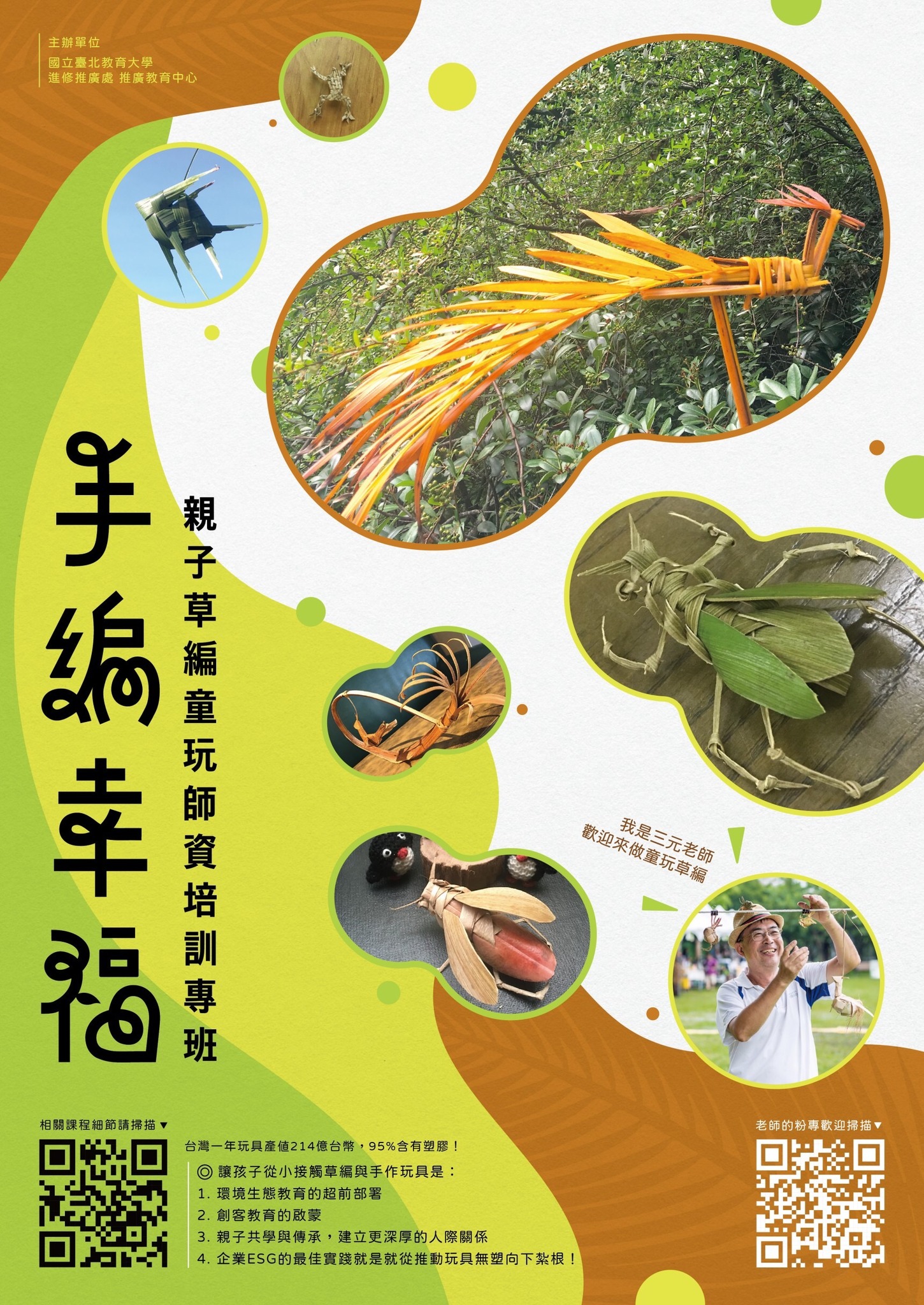 | 一、 | 草編幸福-童玩技藝師資培訓:112年4月8日週六9:00-16:00共6小時,全勤並通過評核將核發研習證明書。課程特聘專業草編達人「草編CEO林三元老師」親授,包含戶外採集、戶外與教室型態的教學示範、草編文化歷史理論介紹,豐富多樣的內容不藏私分享,歡迎18歲以上對草編童玩有興趣之教師或一般民眾報名。 |