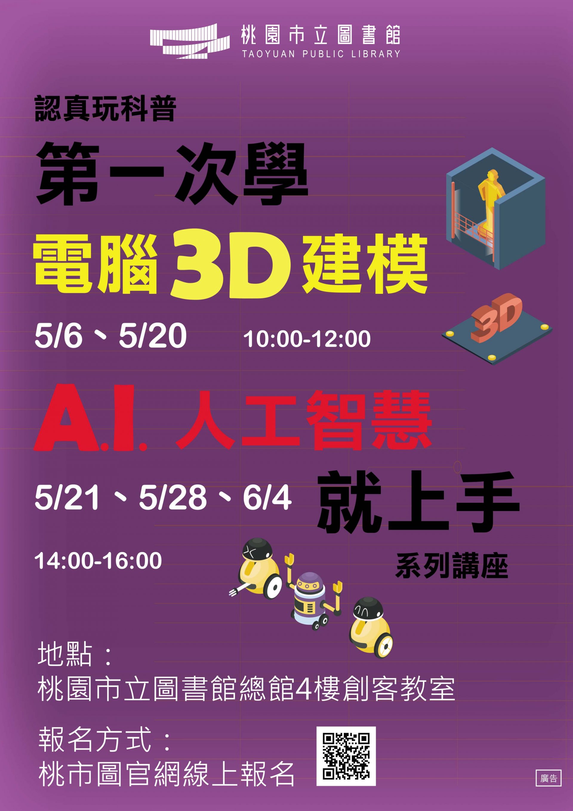 旨案活動於5月6日、5月20日(六)上午10時至12時,5月21日、5月28日、6月4日(日)下午2時至4時假本館新總館4樓創客教室辦理,將舉辦以基礎入門的3D建構與AI人工智慧為主題的科技系列講座,帶孩童對現在新穎的科技知識有初步了解,並知曉應用方向。