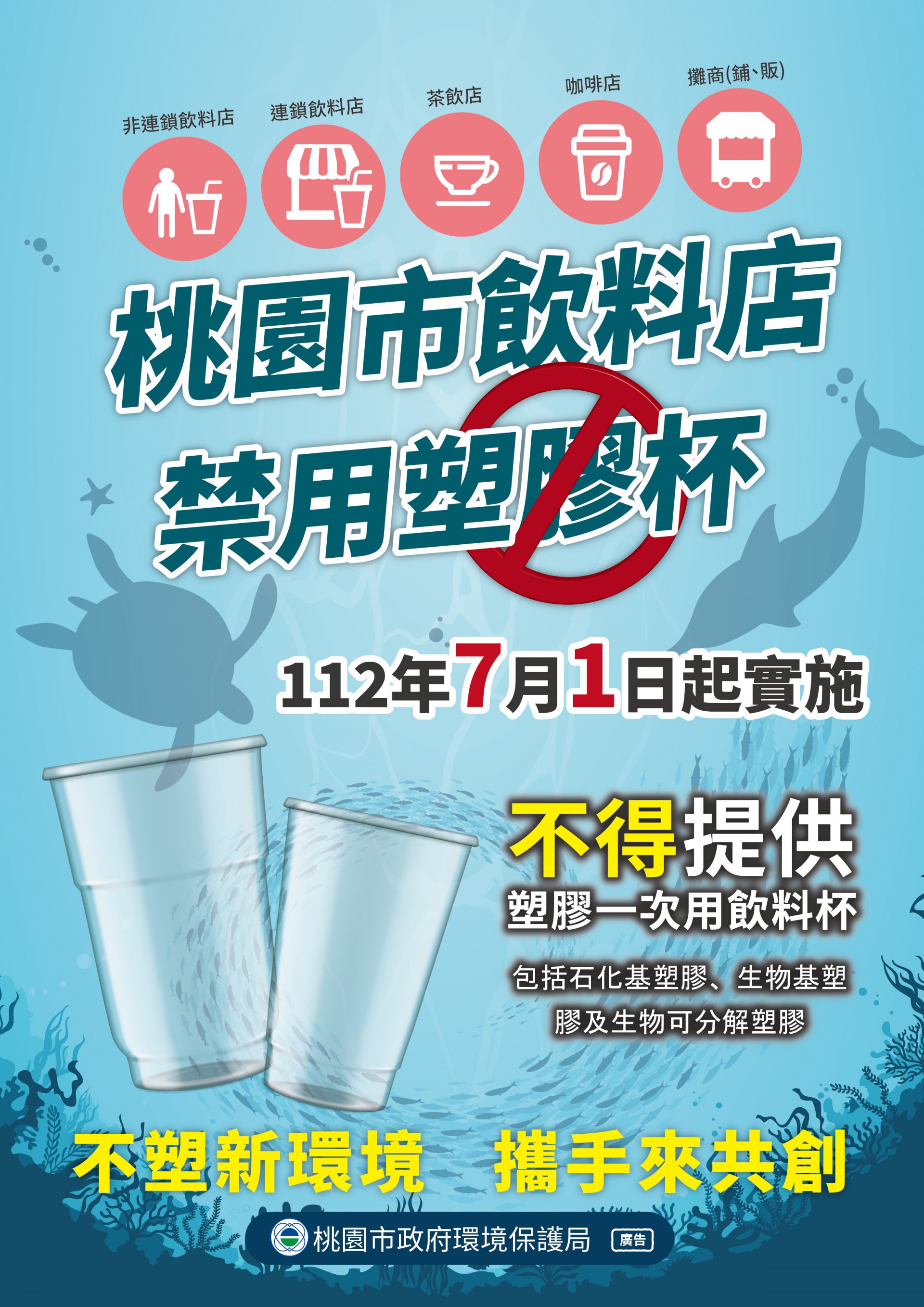 配合行政院環境保護署限塑政策擴大限制對象別,本市飲料 店自112年7月1日起不得提供塑膠一次用飲料杯(包括石化 基塑膠、生物基塑膠及生物可分解塑膠),限制使用對象包 含茶飲店、咖啡店、冷熱飲店及攤商(舖、販)。