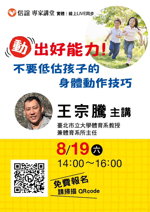 | 一、 | 足夠與正確的身體動作能力,不僅為孩子的好體力打底,更可以提升孩子的學習能力,是活化大腦、穩定情緒的重要途徑!信誼基金會以此為題,於2023年8月19日(六)舉辦【「動」出好能力!不要低估孩子的身體動作技巧】講座,本講座同時採用實體與線上課程進行,邀請爸媽及老師免費報名參加。 |